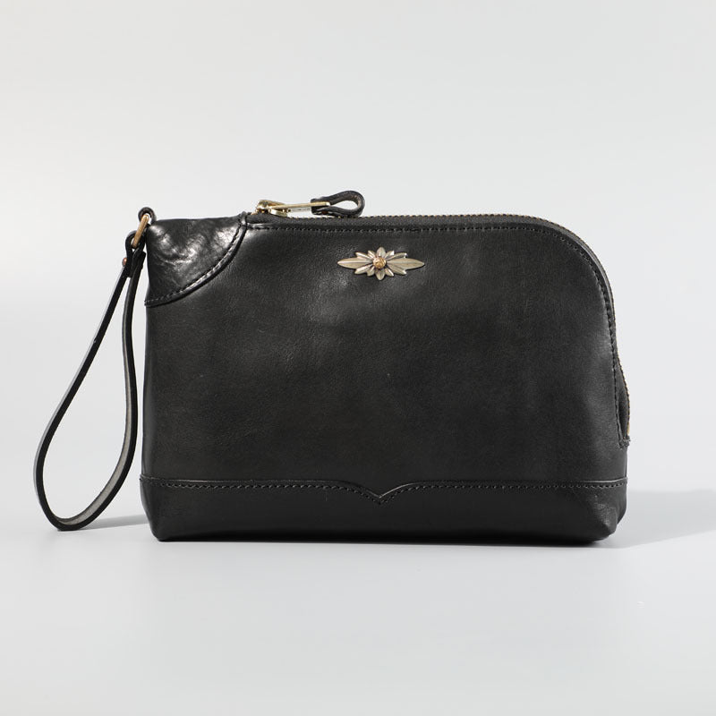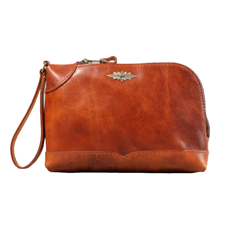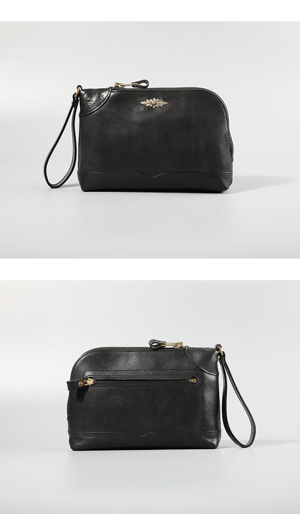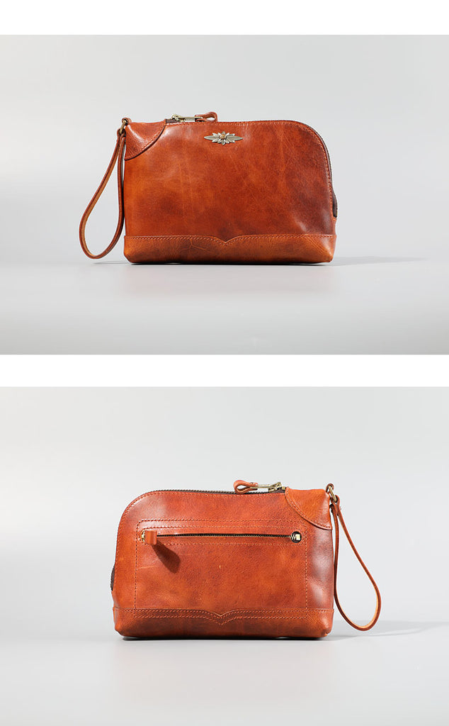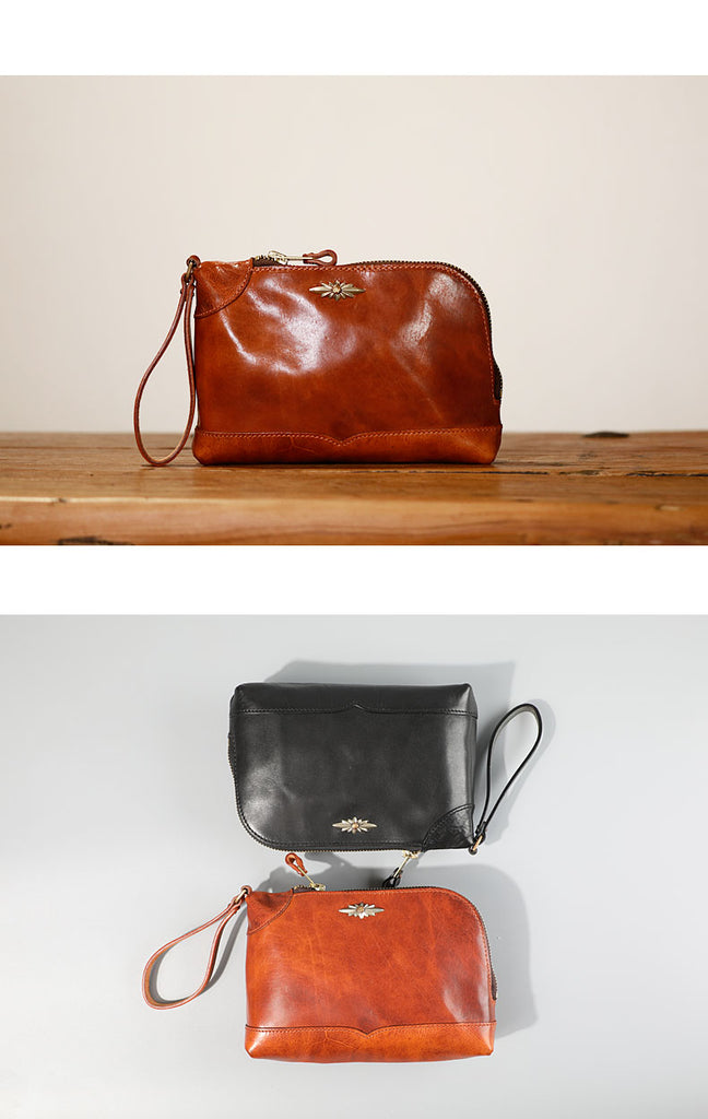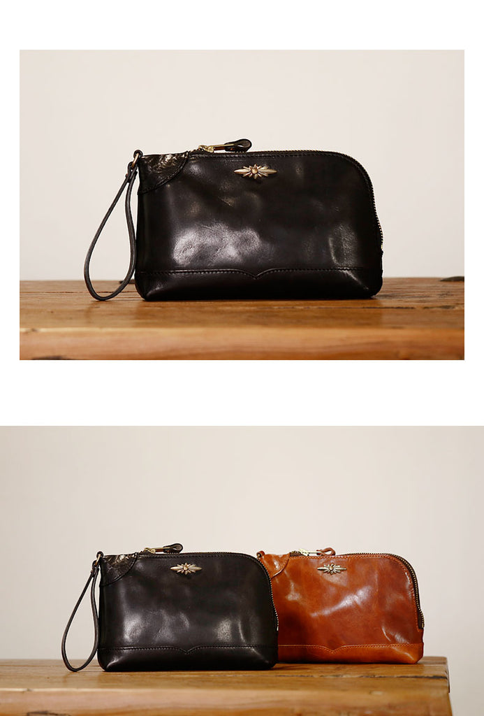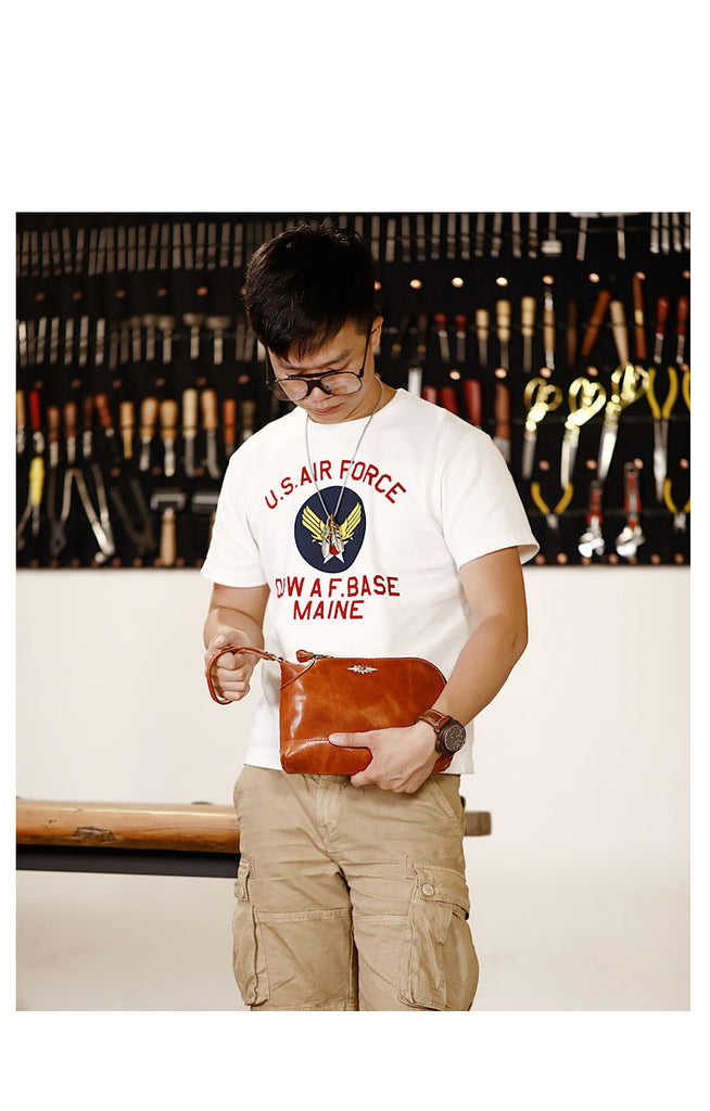 Design: Genuine Leather Hand-stitched Mens 8 inches Clutch Shoulder Bag Zipper Clutch Wristlet Wallet for Men