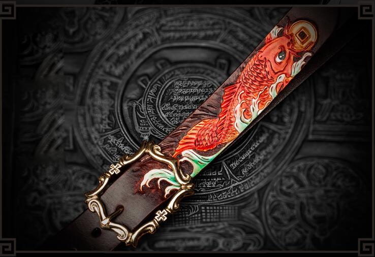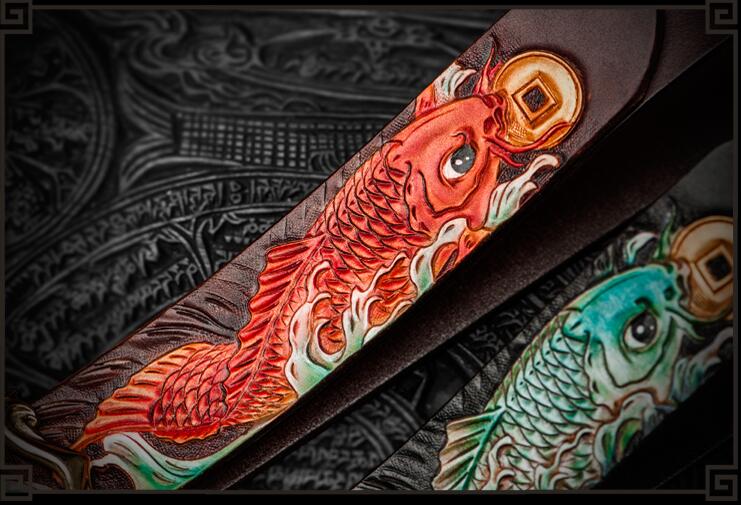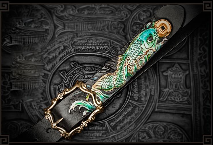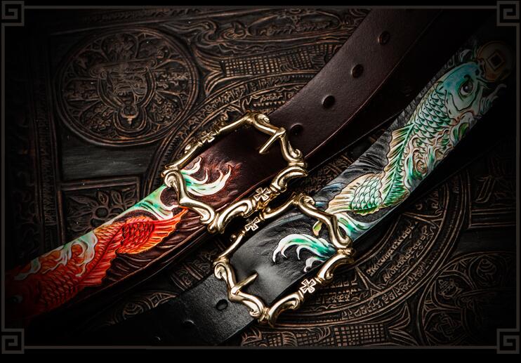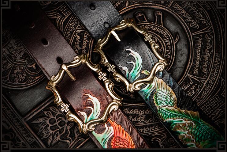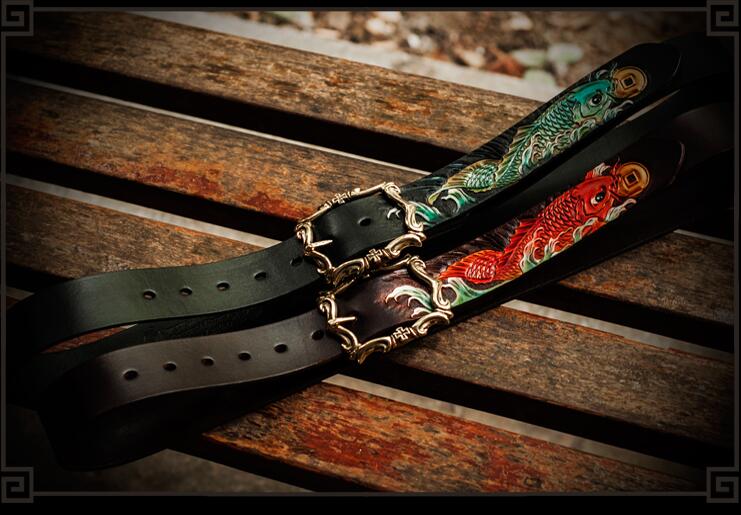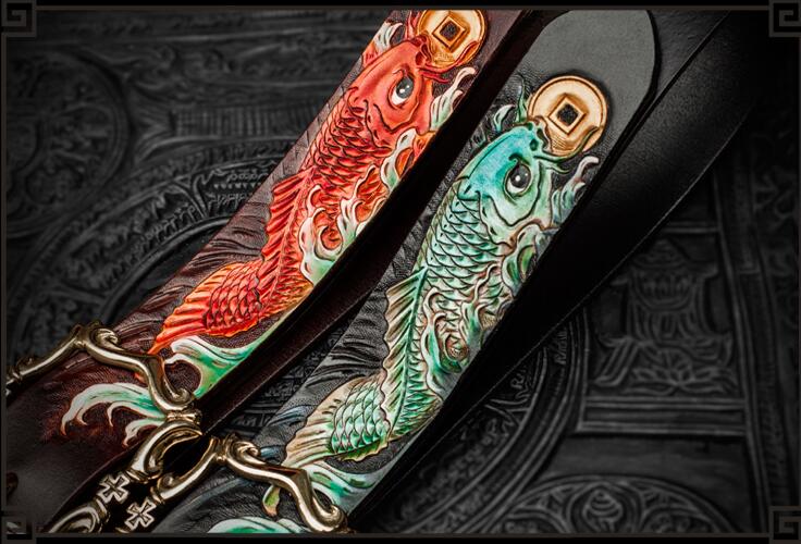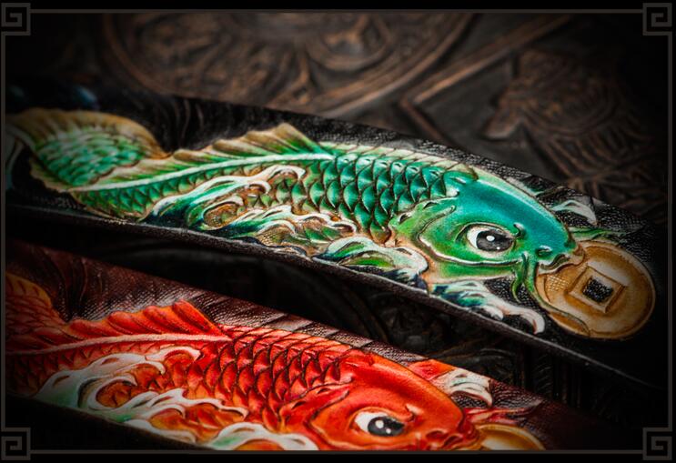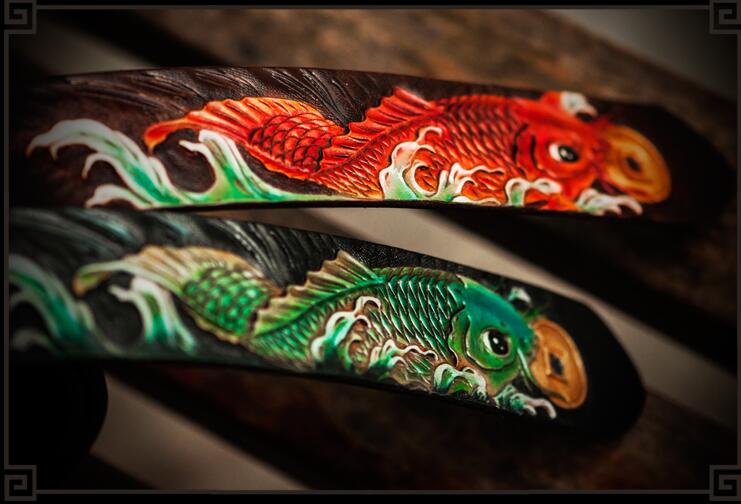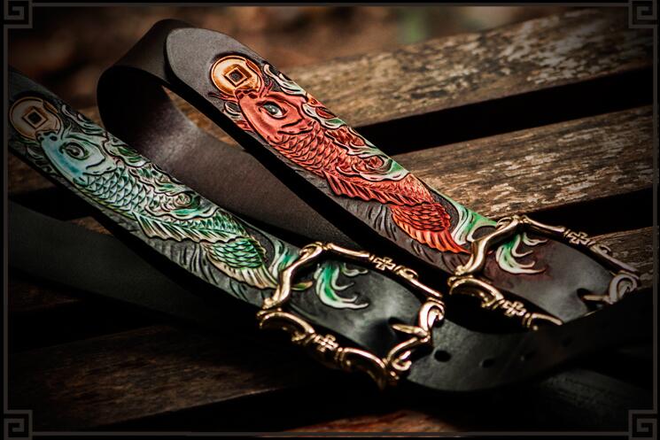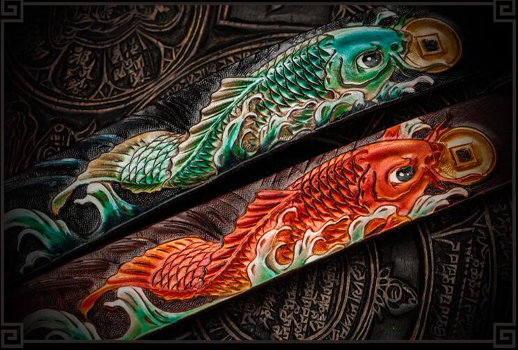 Style: Handmade Genuine Leather Tooled Carp Mens Belt Custom Cool Leather Men Belt for Men