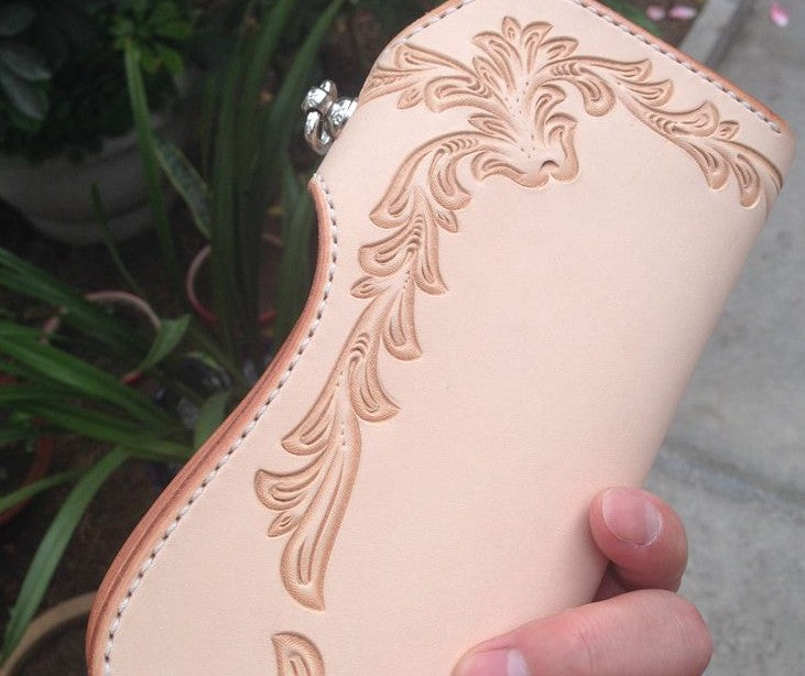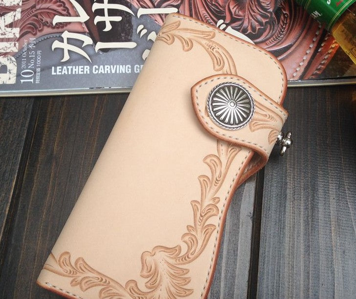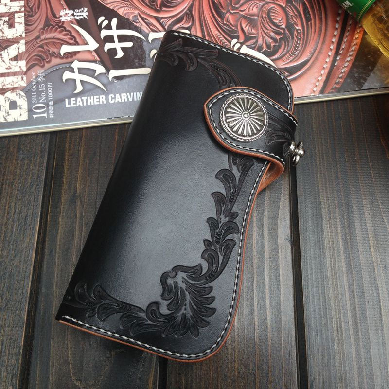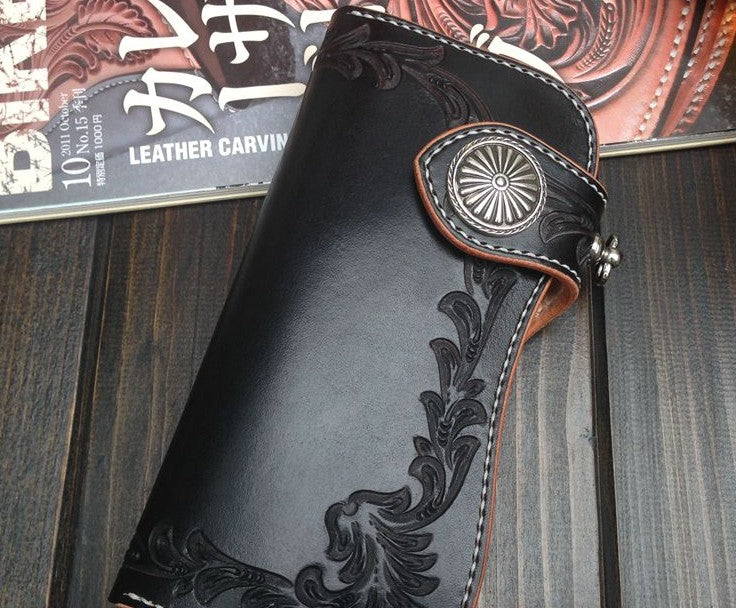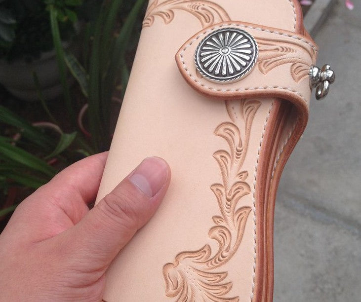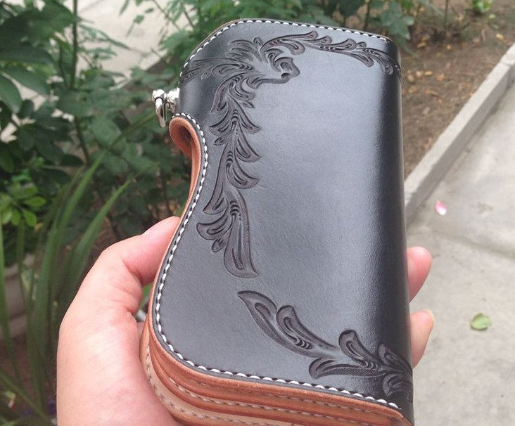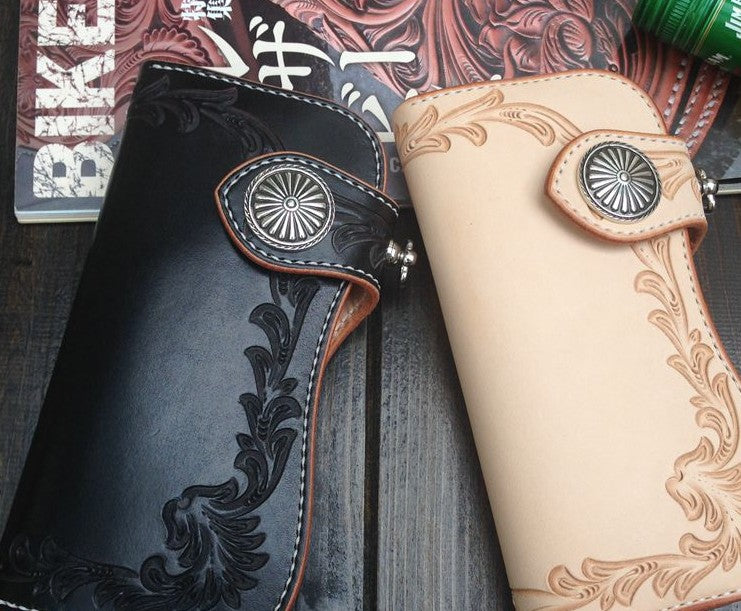 Style: Handmade Leather Biker Wallet Tooled Floral Mens Cool Chain Wallet Trucker Wallet with Chain