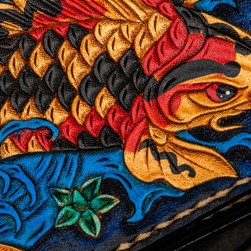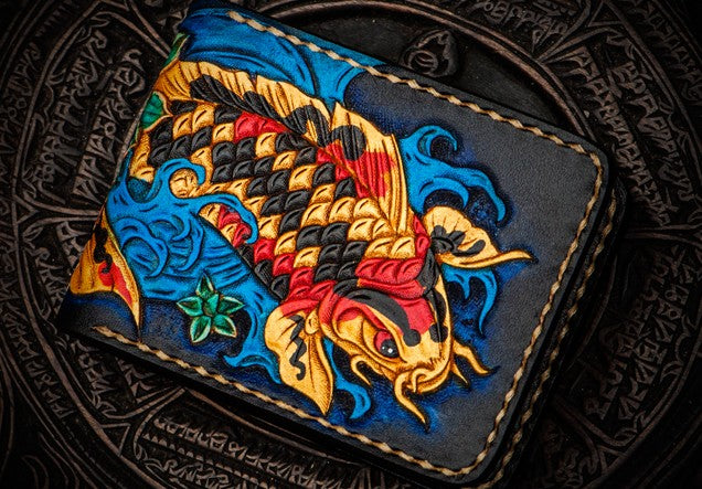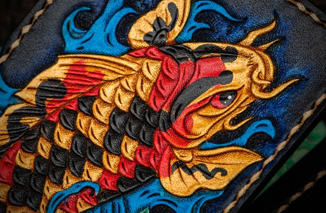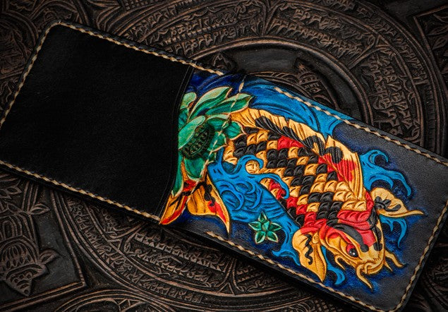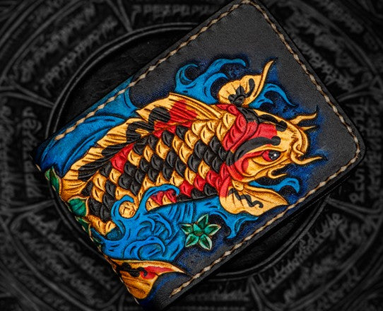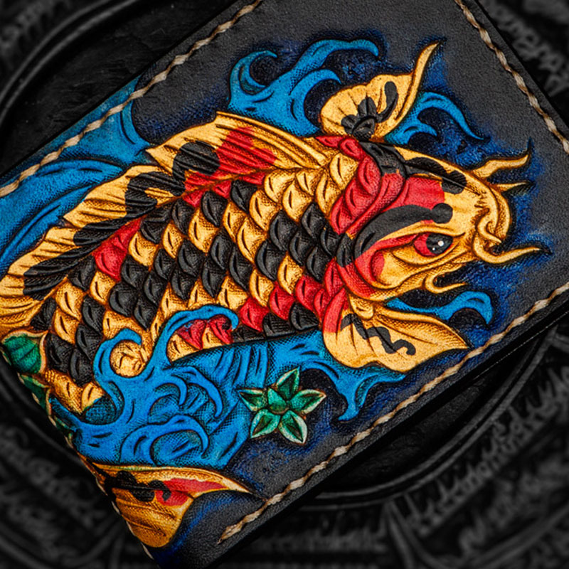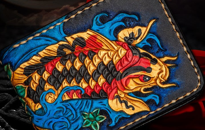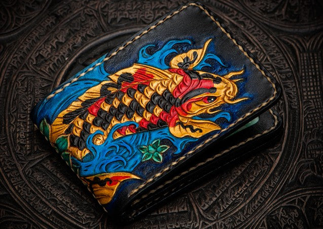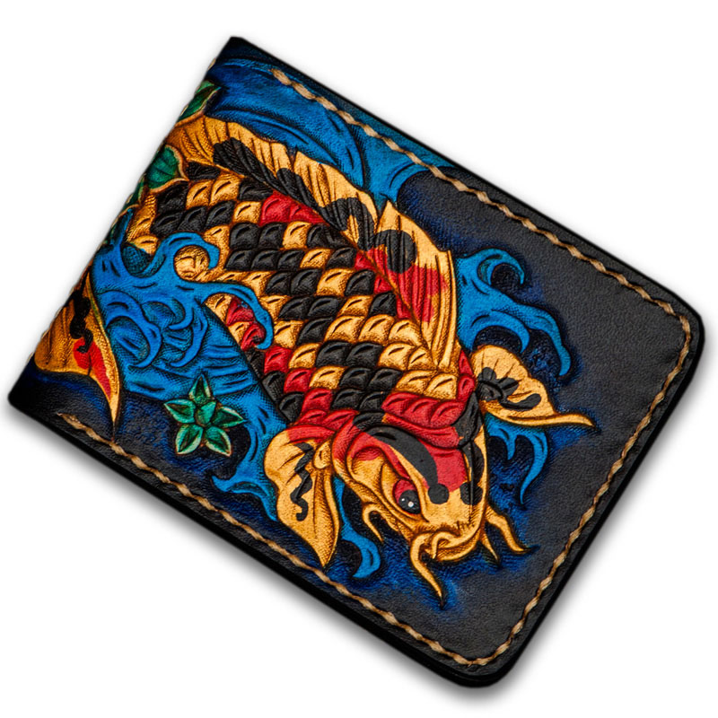 Design: Handmade Leather License Wallet Tooled Carp Mens billfold Wallet Cool Leather Wallet Slim Wallet for Men