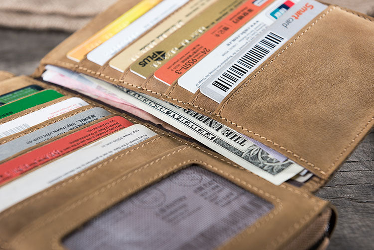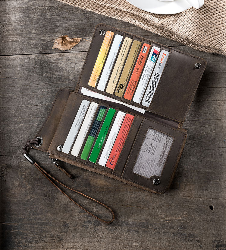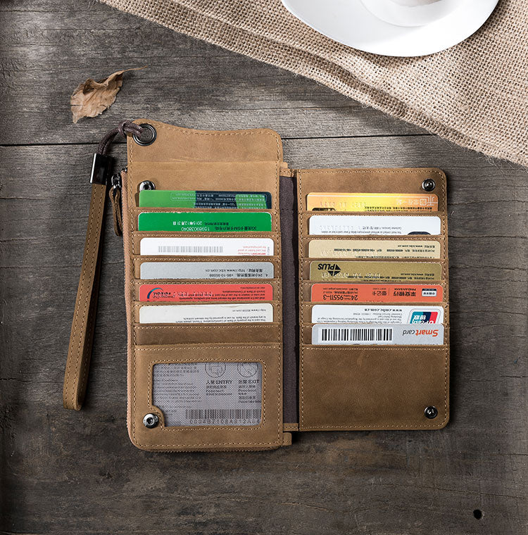 Slots: 2 full size bill slot, 13 card holders,1 zipper slot, 1 phone slot