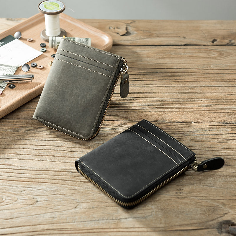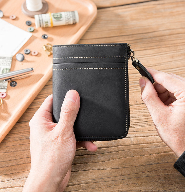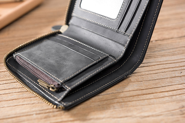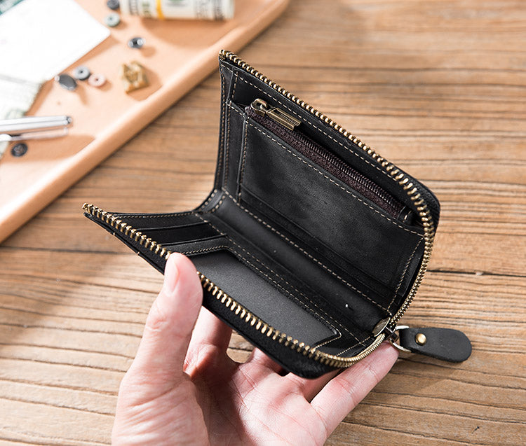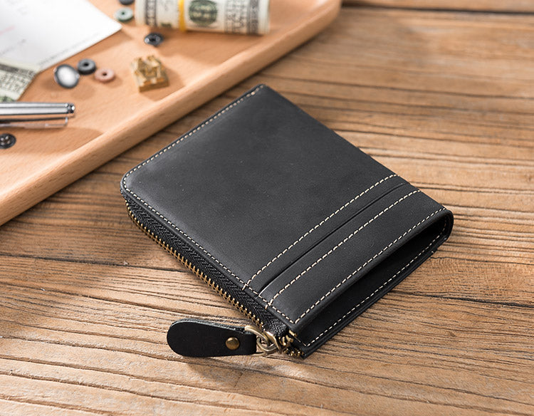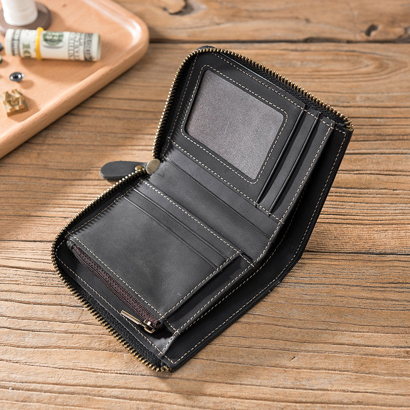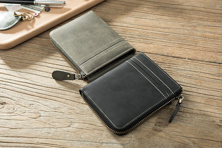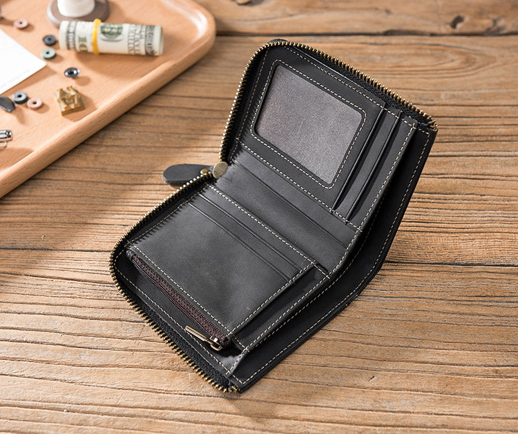 Handmade Leather Mens Cool Slim Leather Zipper Wallet Men Small Wallets Bifold for Men