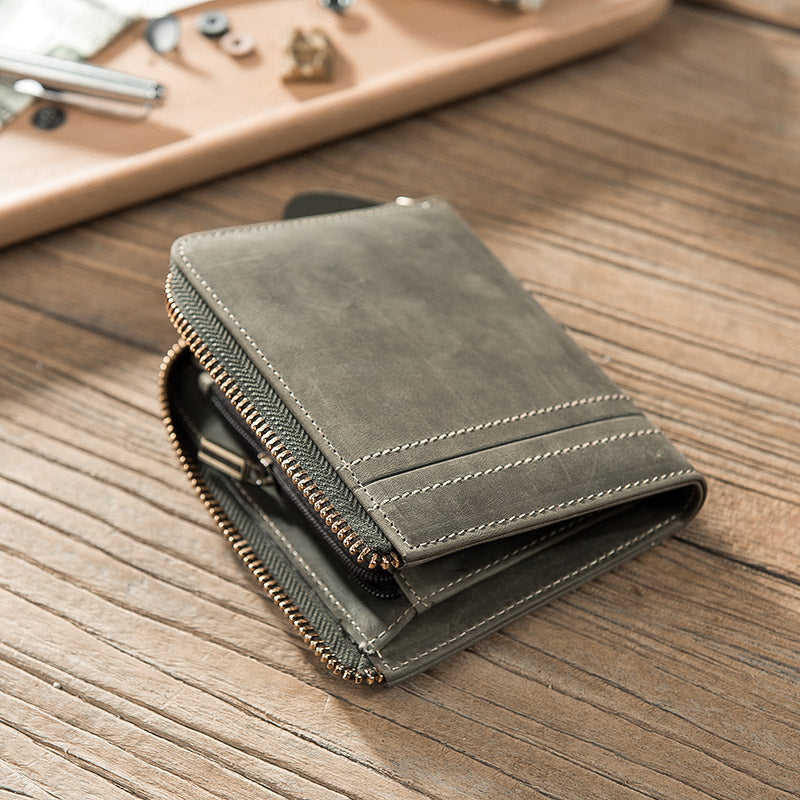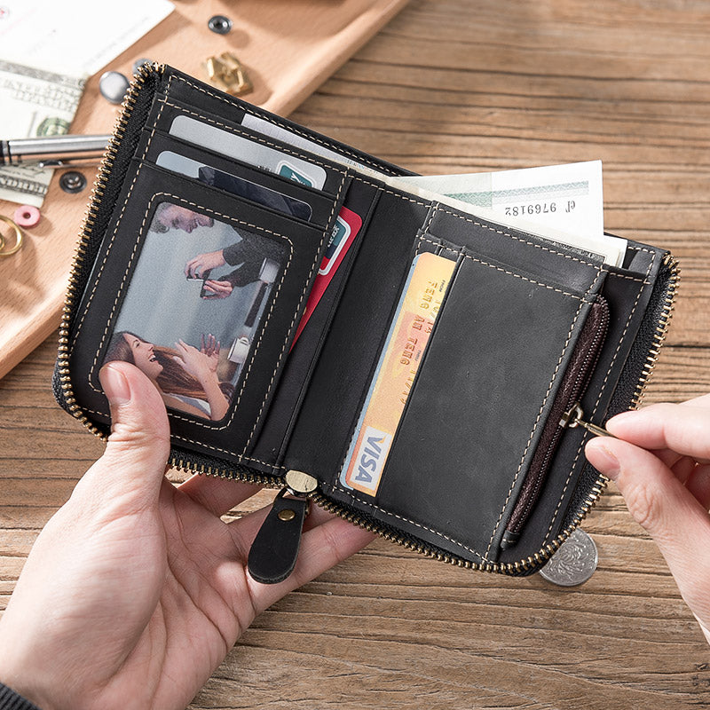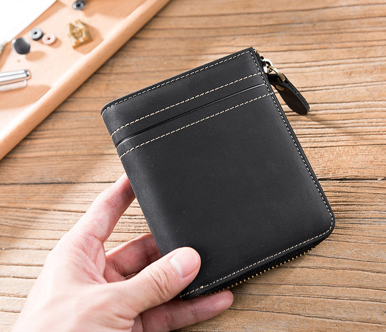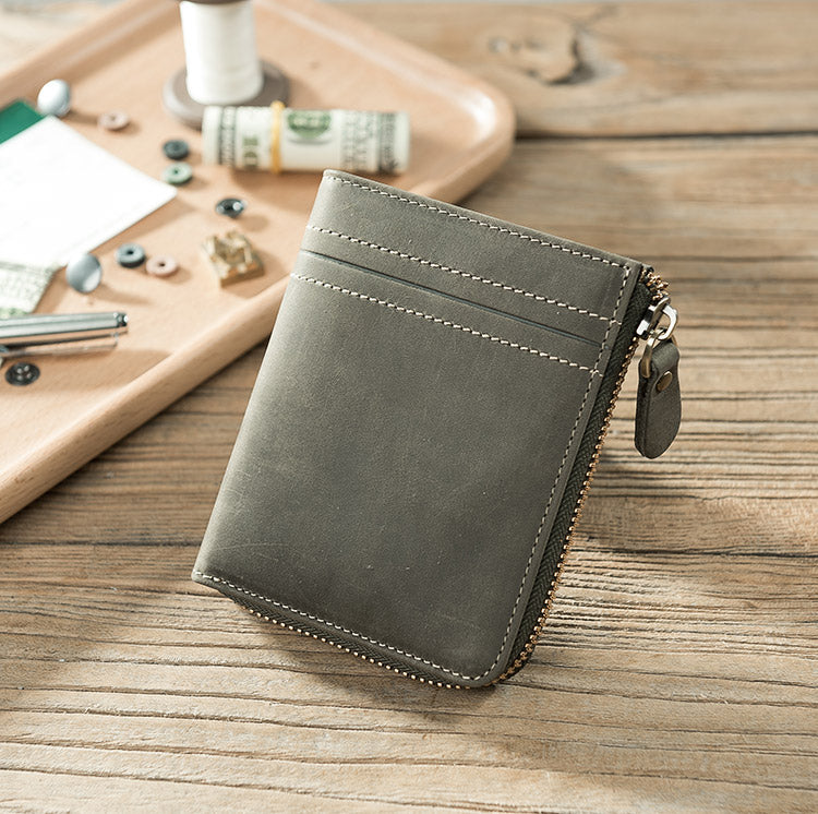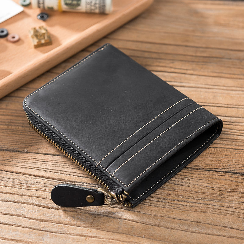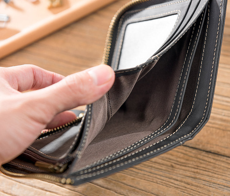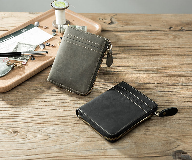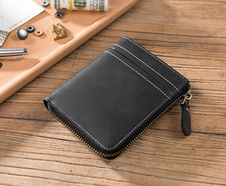 Handmade Leather Mens Cool Slim Leather Zipper Wallet Men Small Wallets Bifold for Men