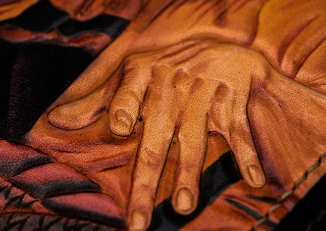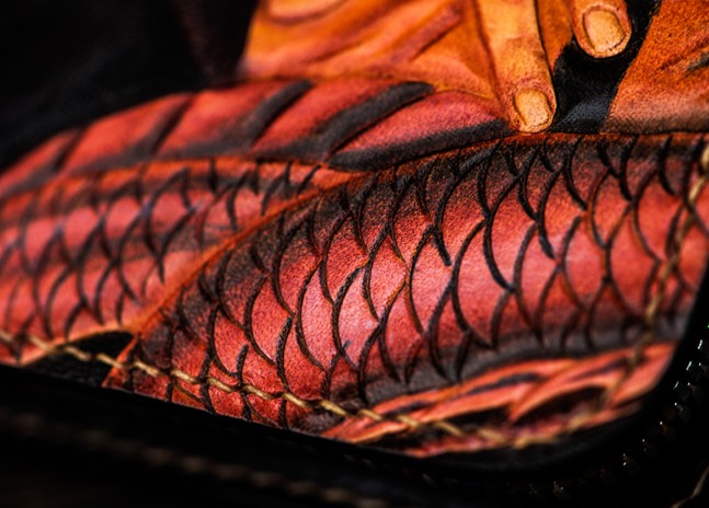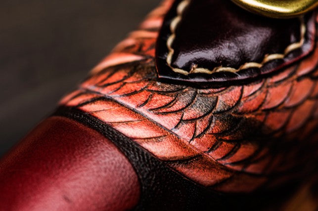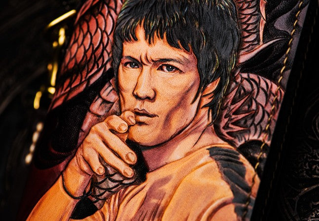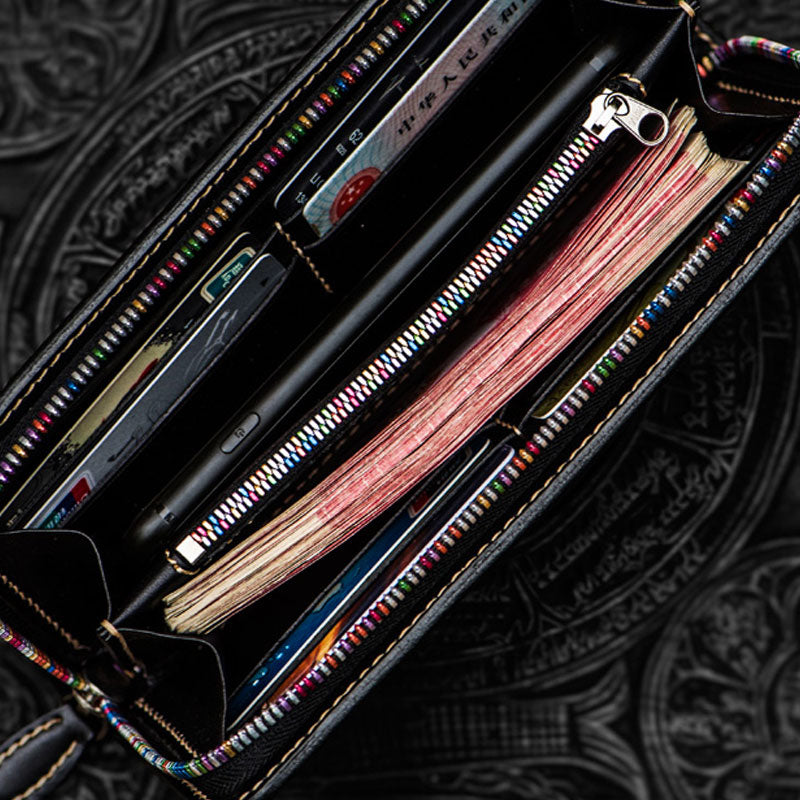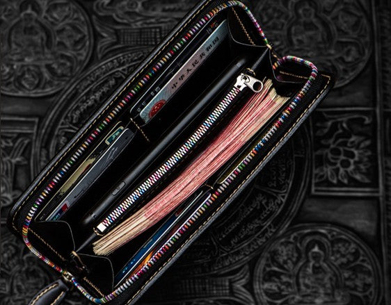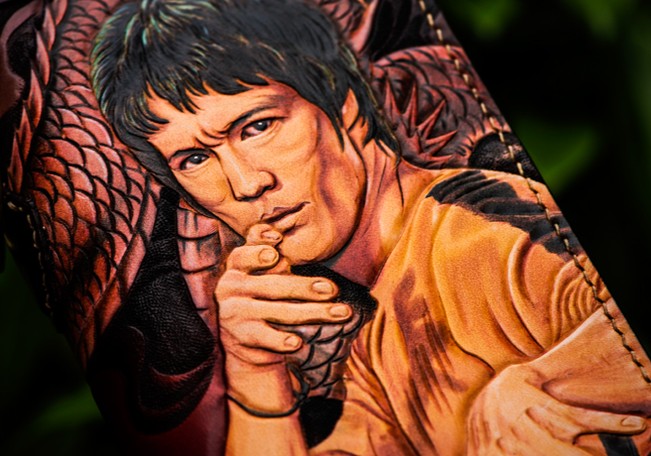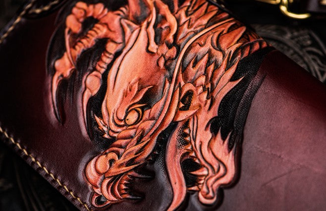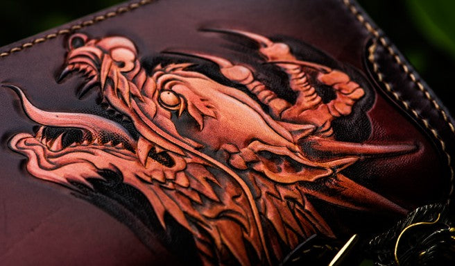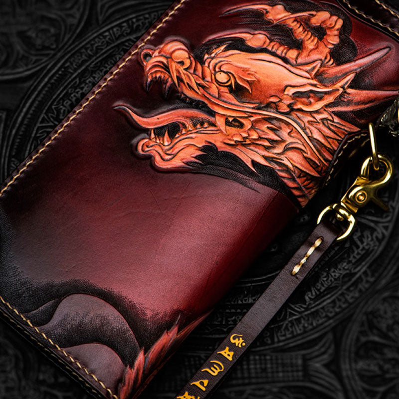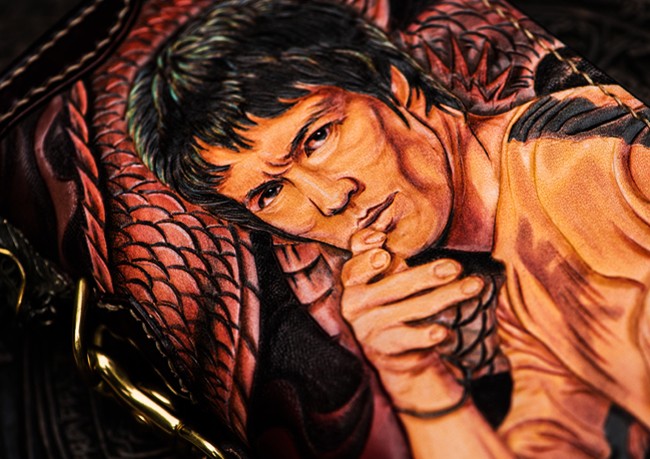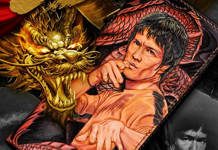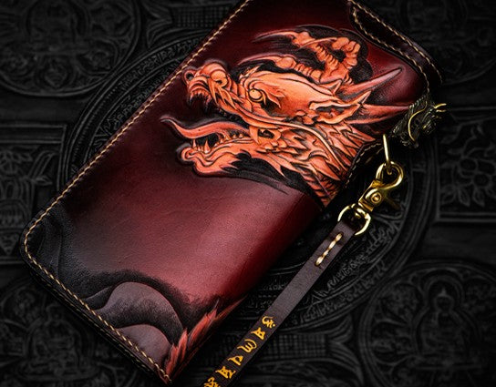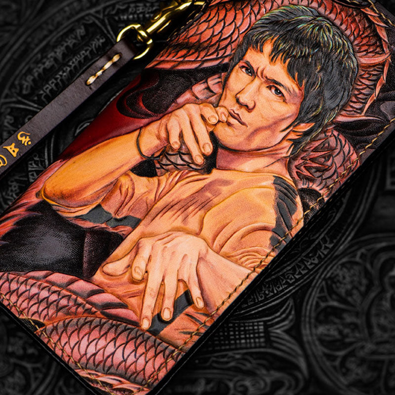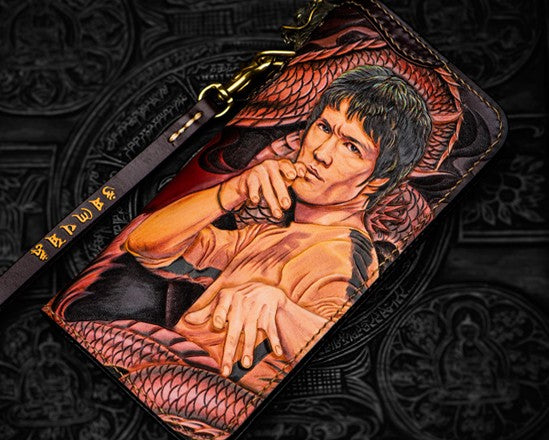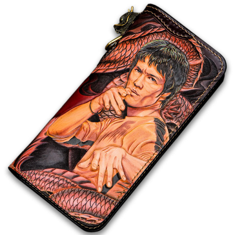 Design: Handmade Leather Tooled Bruce Lee Black Mens Chain Biker Wallet Cool Leather Wallet Long Clutch Wallets for Men
