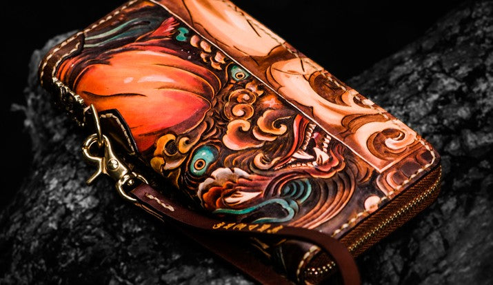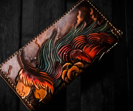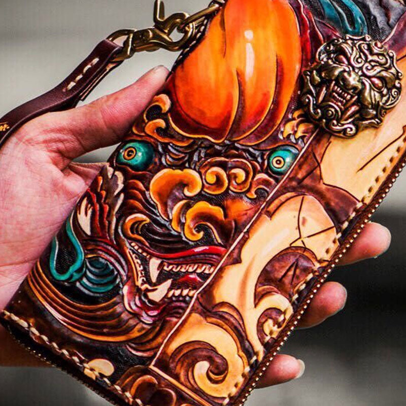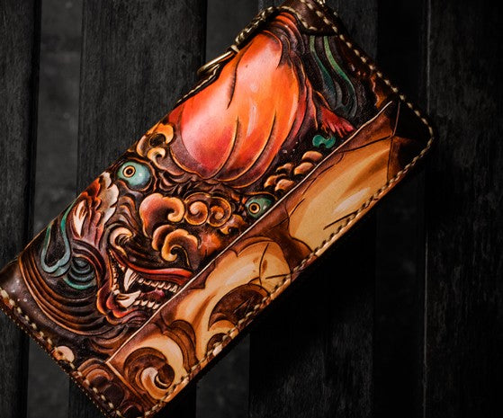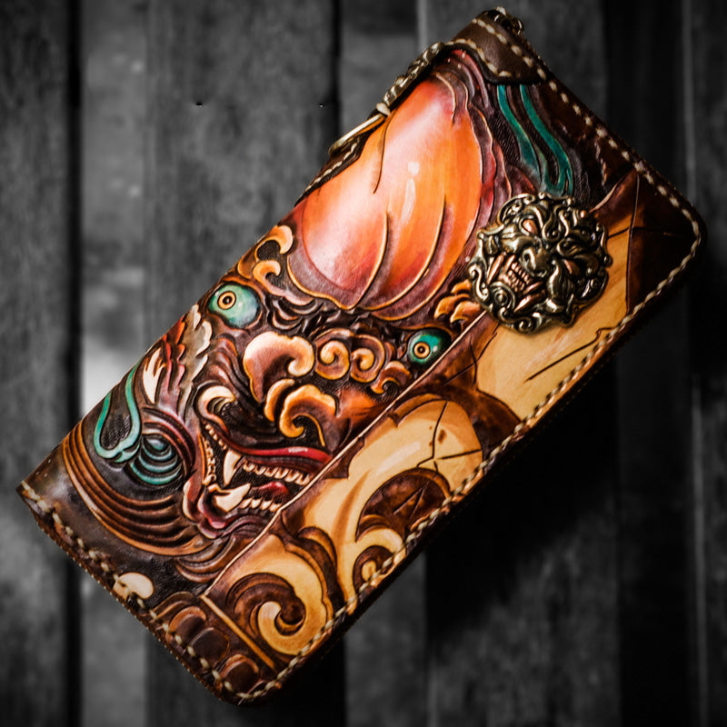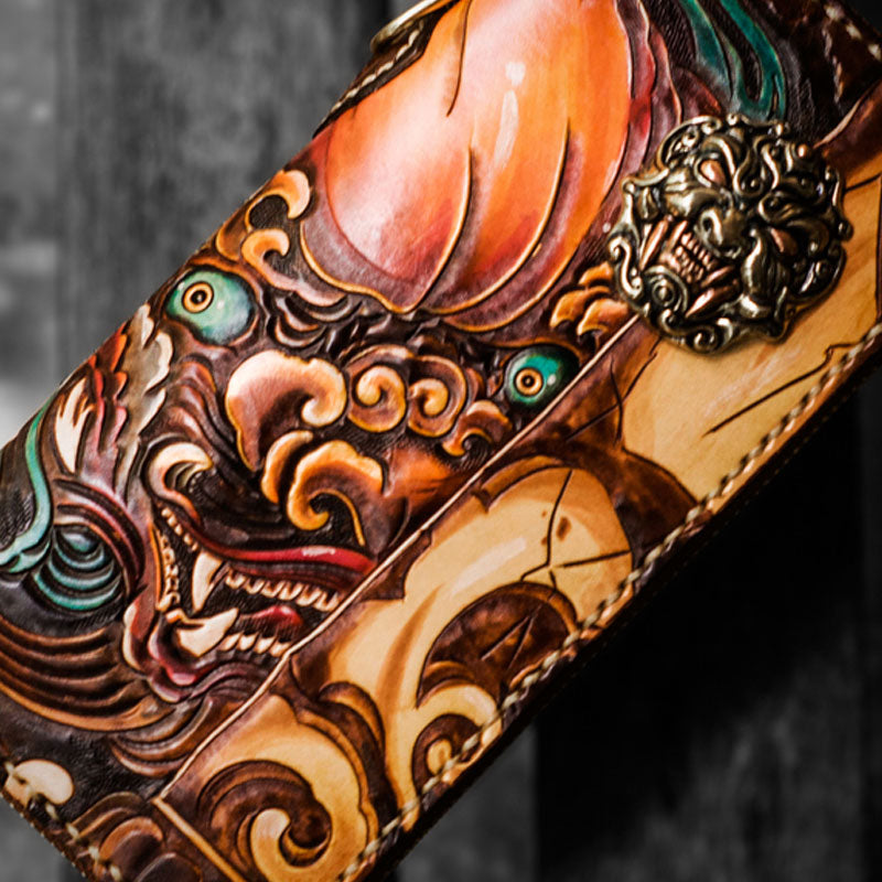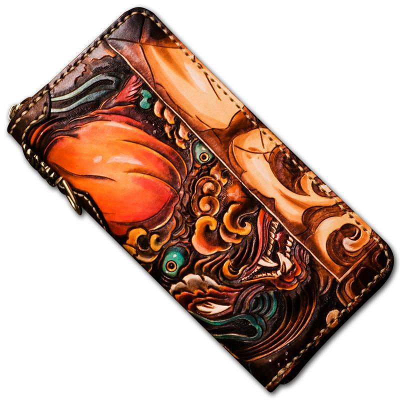 Design: Handmade Leather Tooled Chinese Lion Mens Chain Biker Wallet Cool Leather Wallet Long Phone Wallets for Men