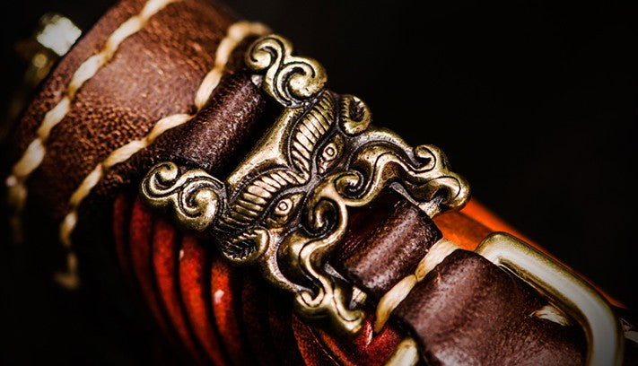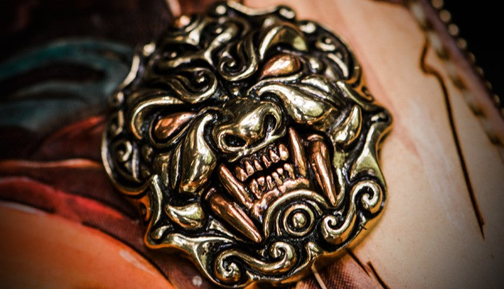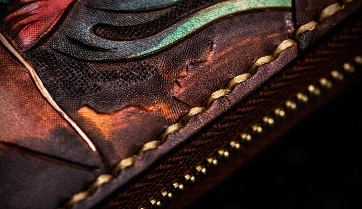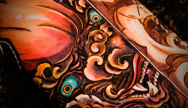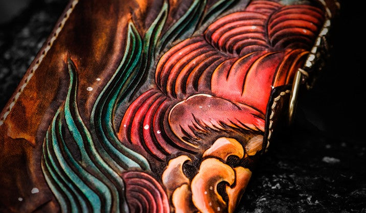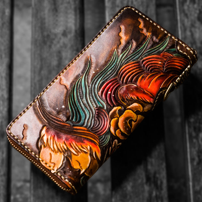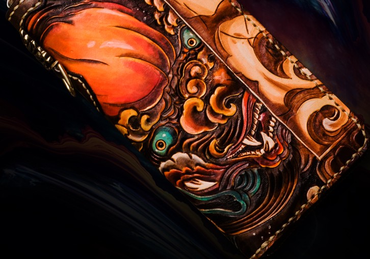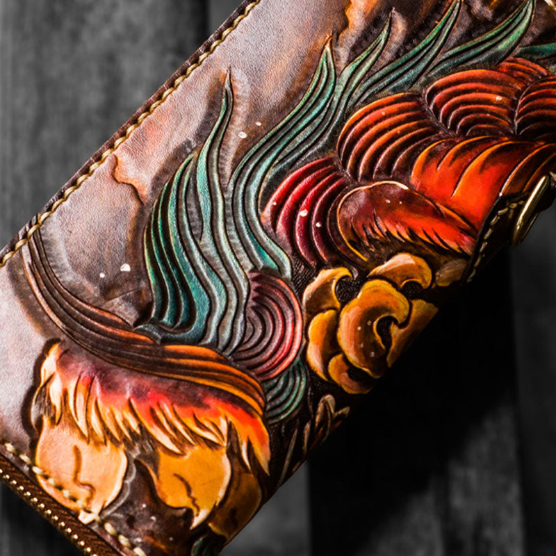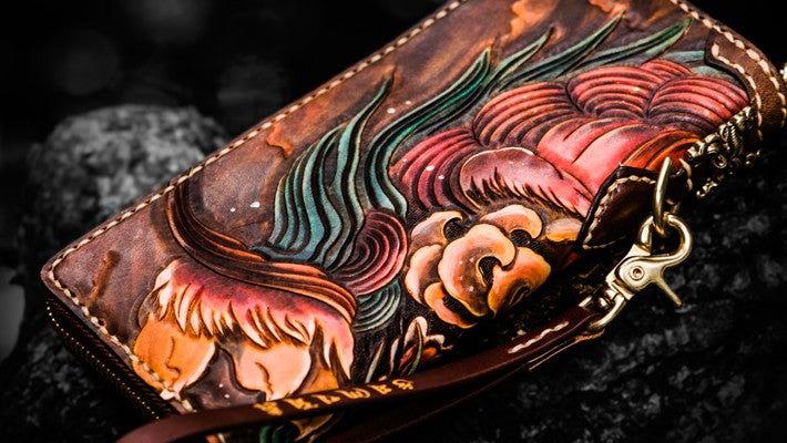 Design: Handmade Leather Tooled Chinese Lion Mens Chain Biker Wallet Cool Leather Wallet Long Phone Wallets for Men