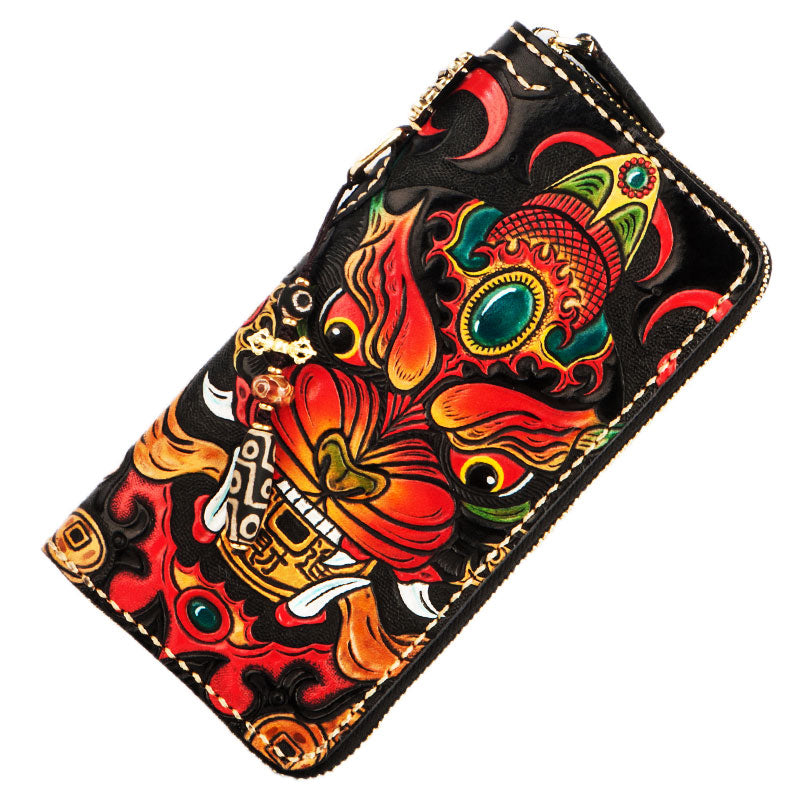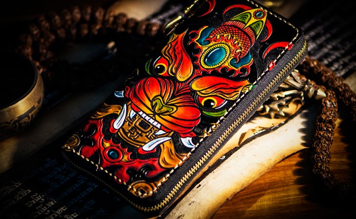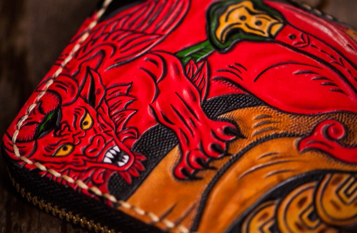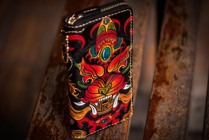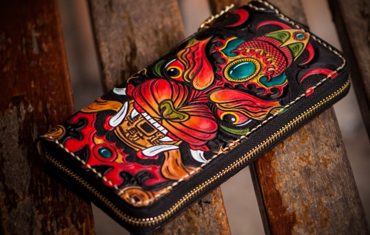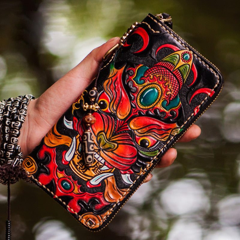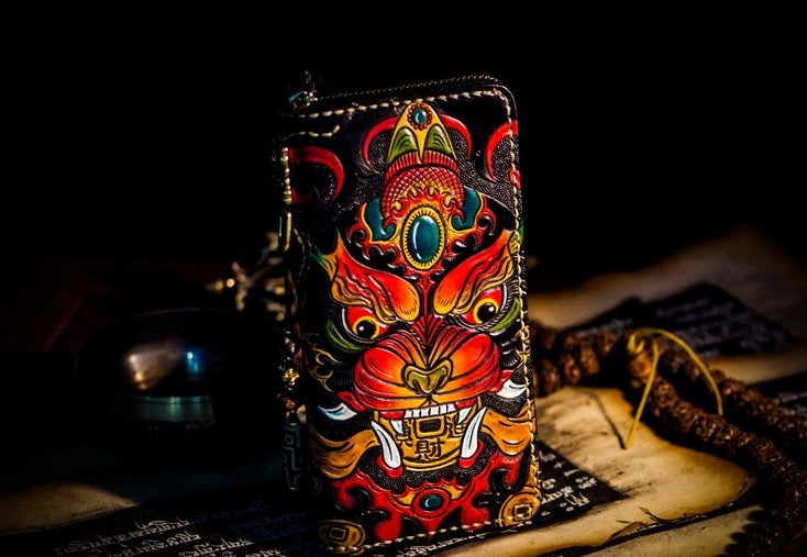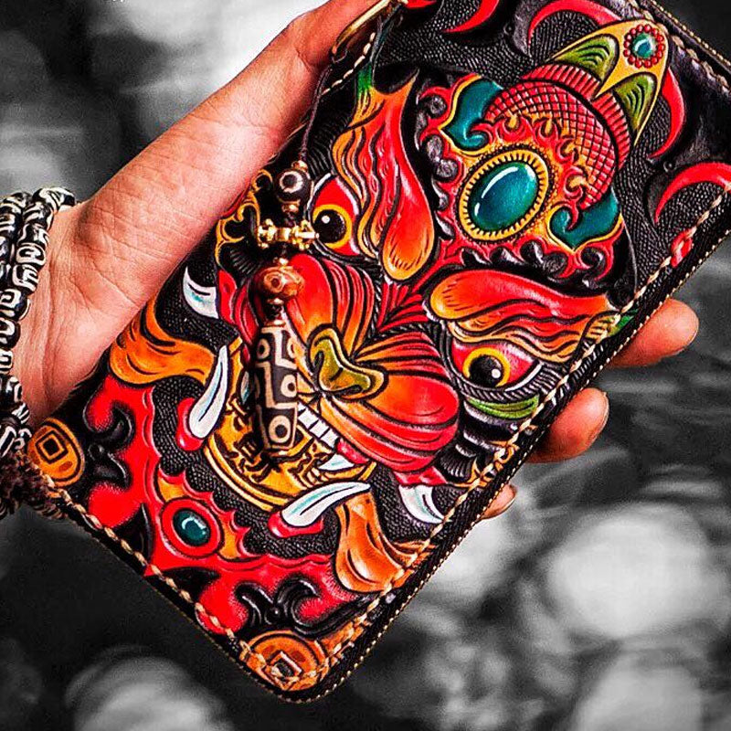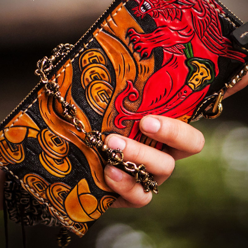 Design: Handmade Leather Tooled Chinese Monster Mens Chain Biker Wallet Cool Leather Wallet Zipper Long Phone Wallets for Men