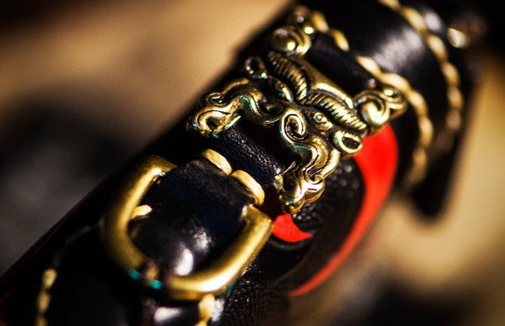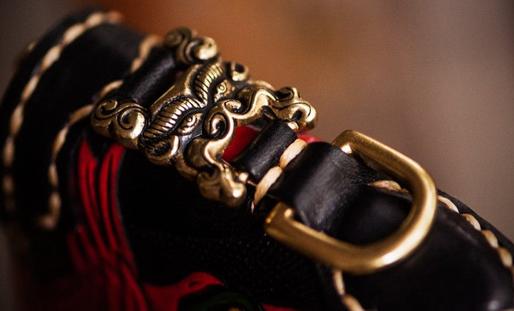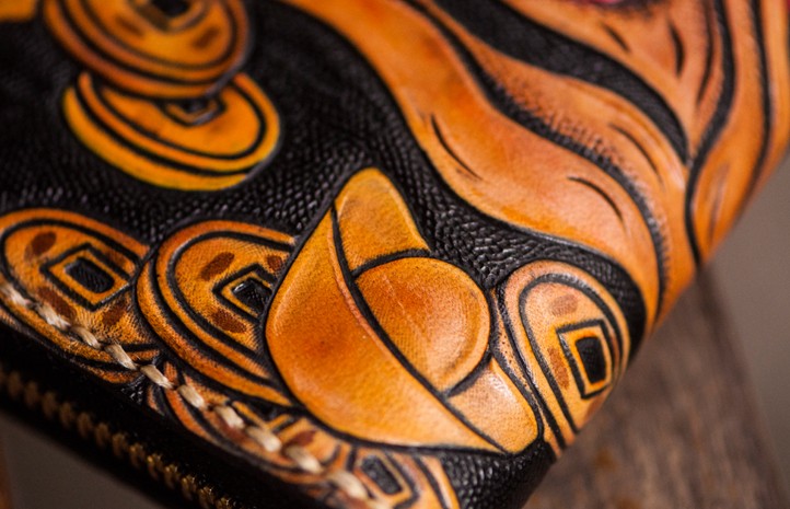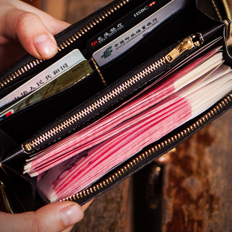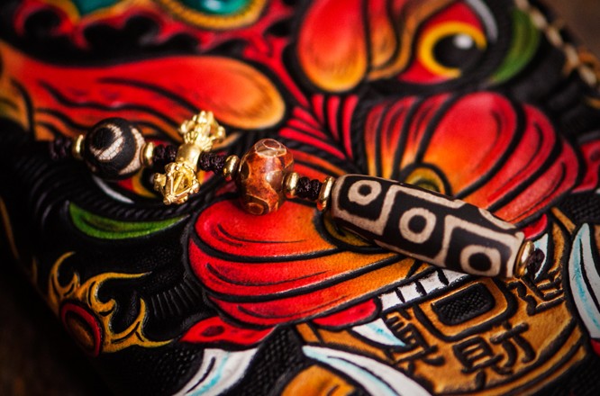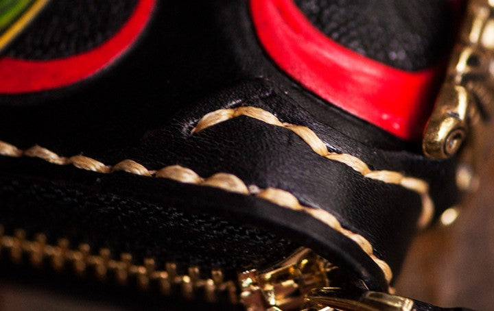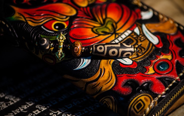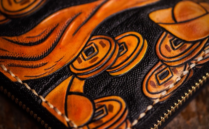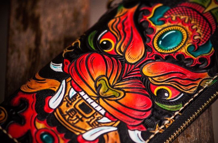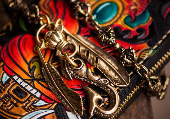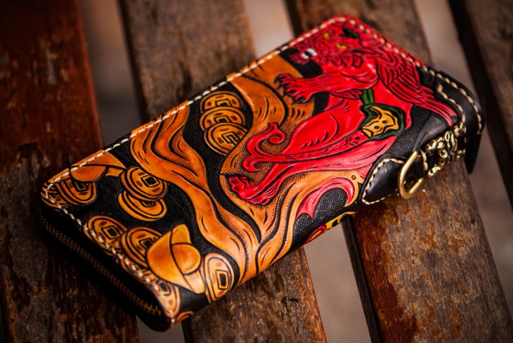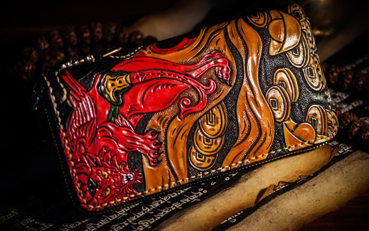 Design: Handmade Leather Tooled Chinese Monster Mens Chain Biker Wallet Cool Leather Wallet Zipper Long Phone Wallets for Men