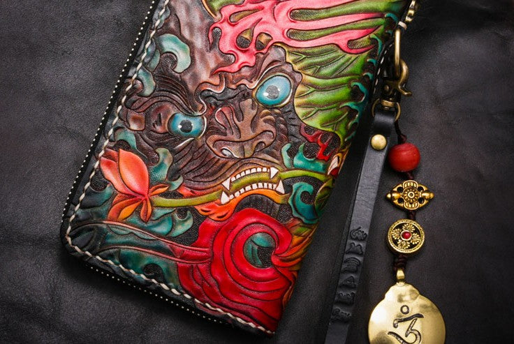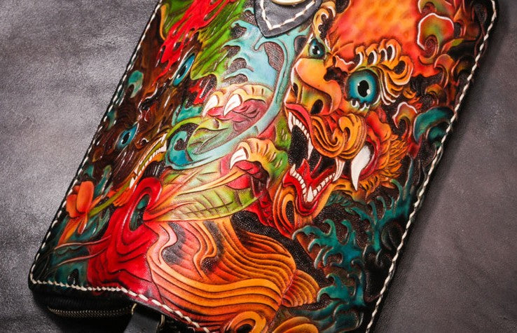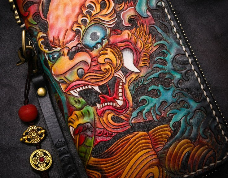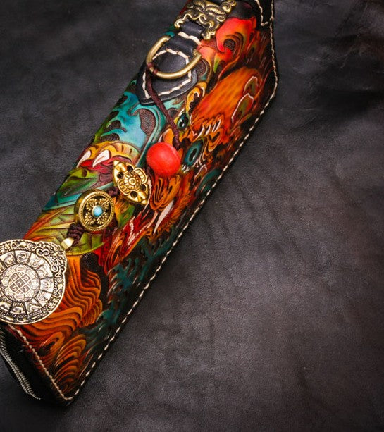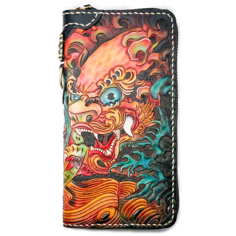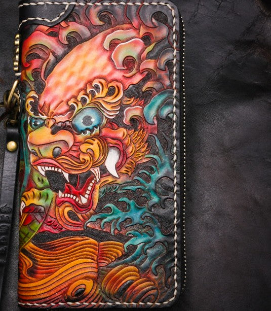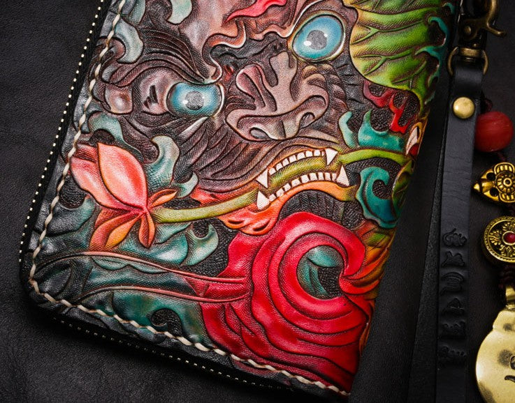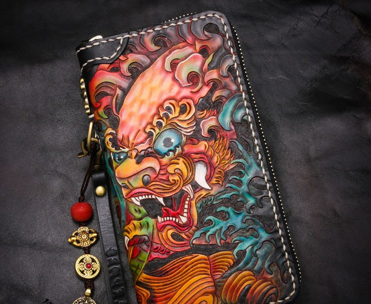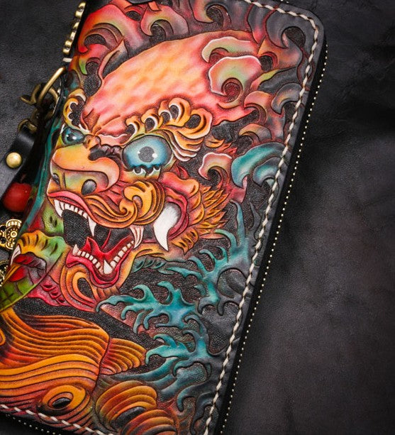 Design: Handmade Leather Tooled ChineseLion Mens Chain Biker Wallet Cool Leather Wallet Long Phone Wallets for Men