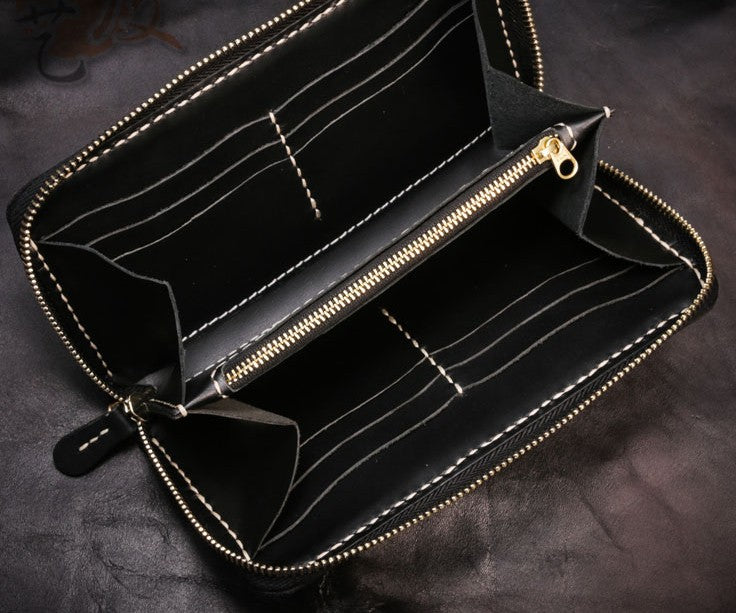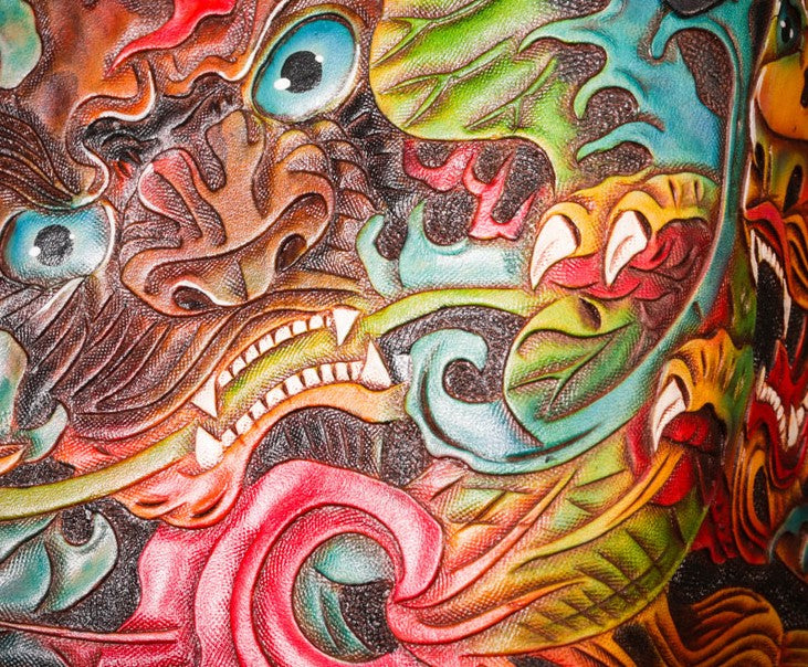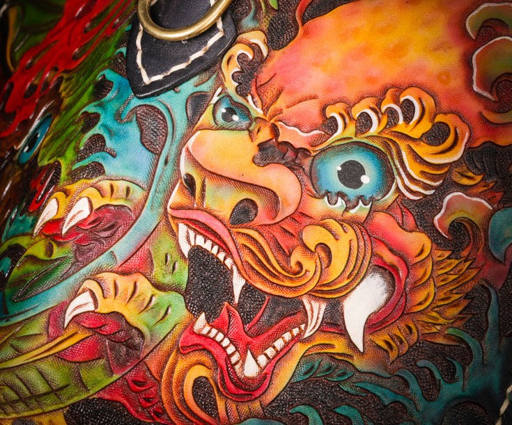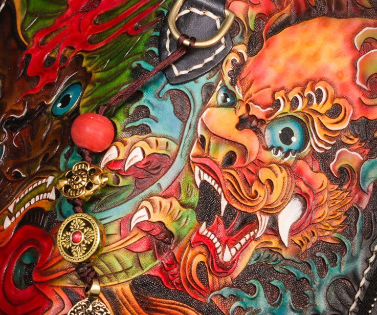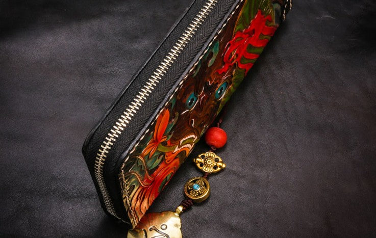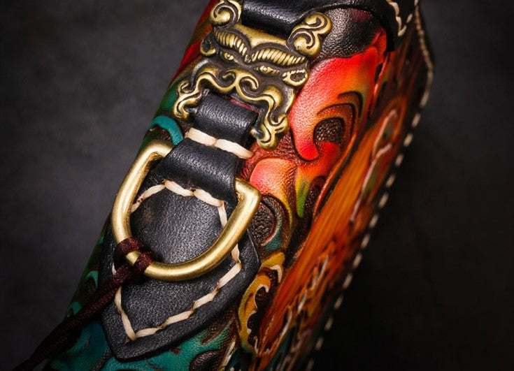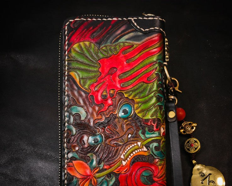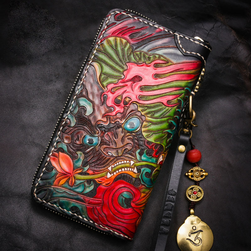 Design: Handmade Leather Tooled ChineseLion Mens Chain Biker Wallet Cool Leather Wallet Long Phone Wallets for Men