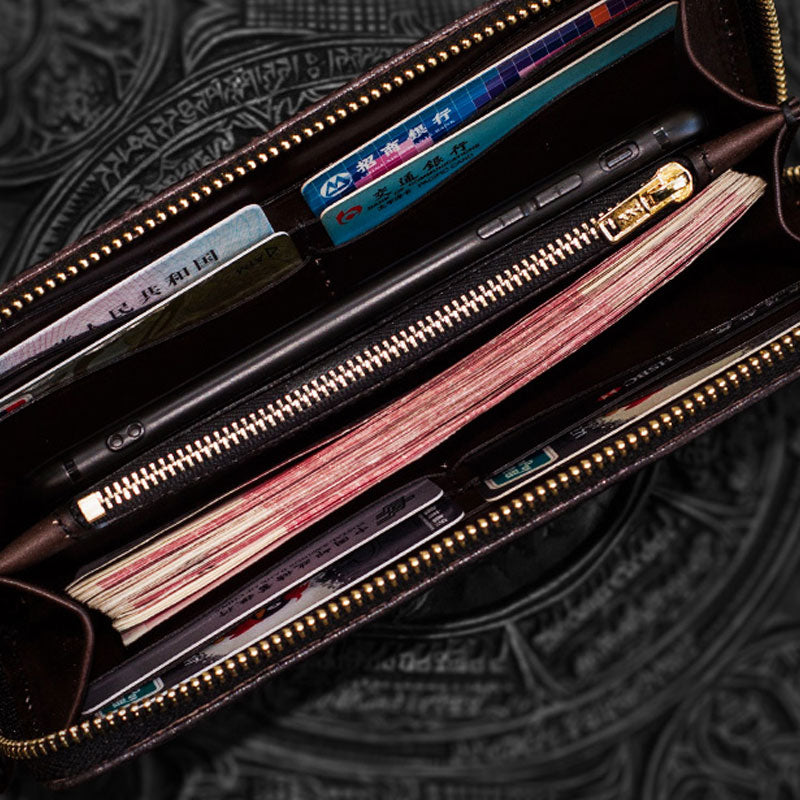 Slots: 2 full size bill slot, 8 card holders, 1 zipper slot