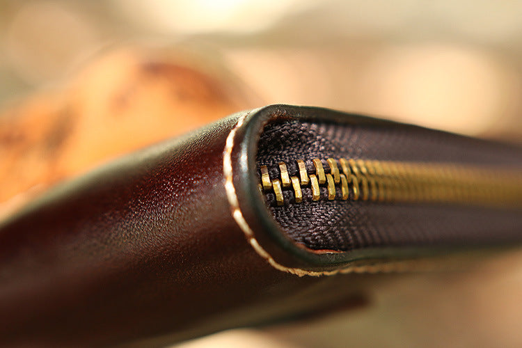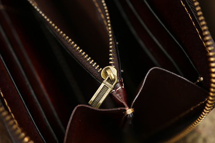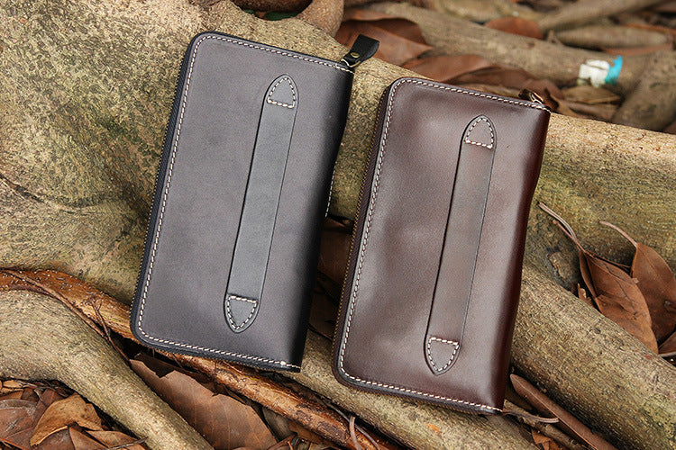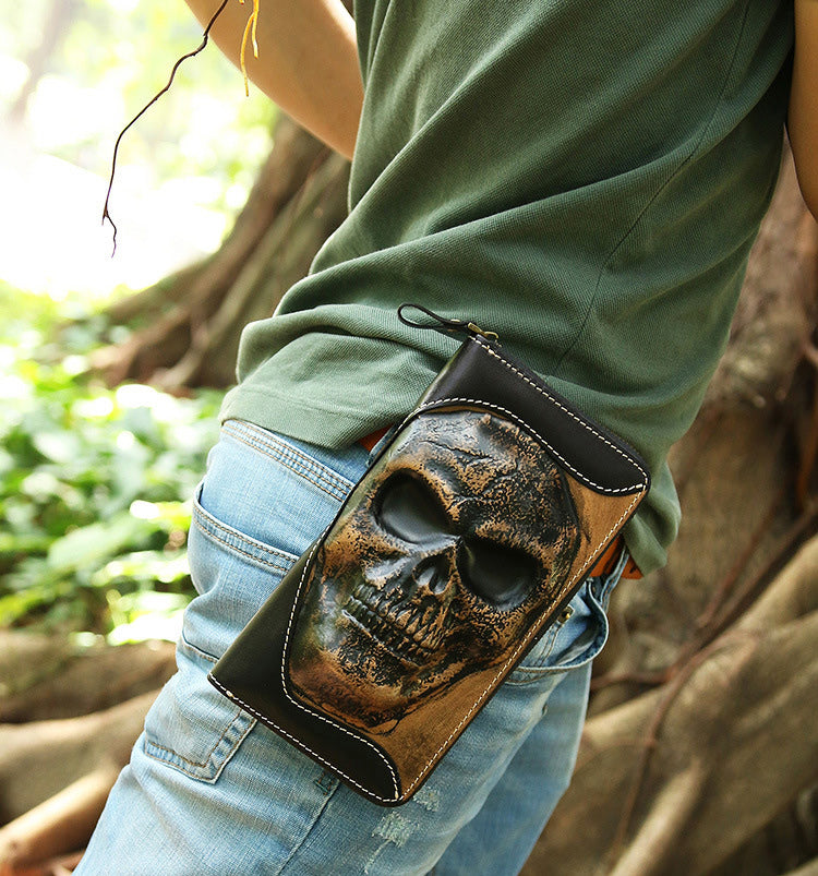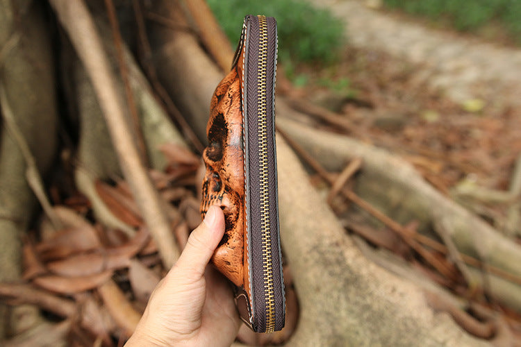Handmade Leather Tooled Relief Skull Long Wallet Cool Skull Zipper Clutch Wristlet Wallet for Men
