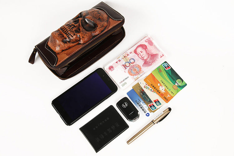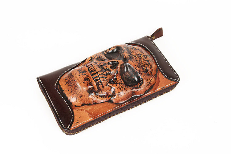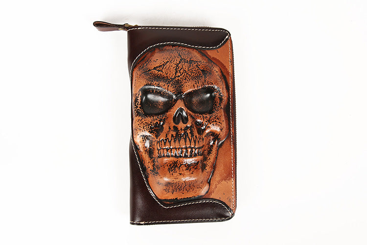 Design: Handmade Leather Tooled Relief Skull Long Wallet Cool Skull Zipper Clutch Wristlet Wallet for Men