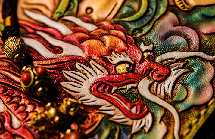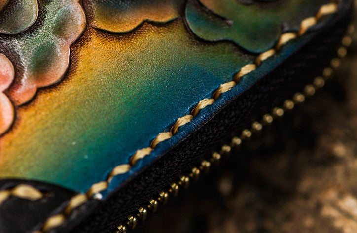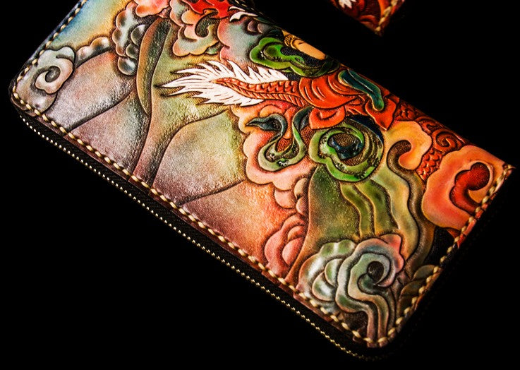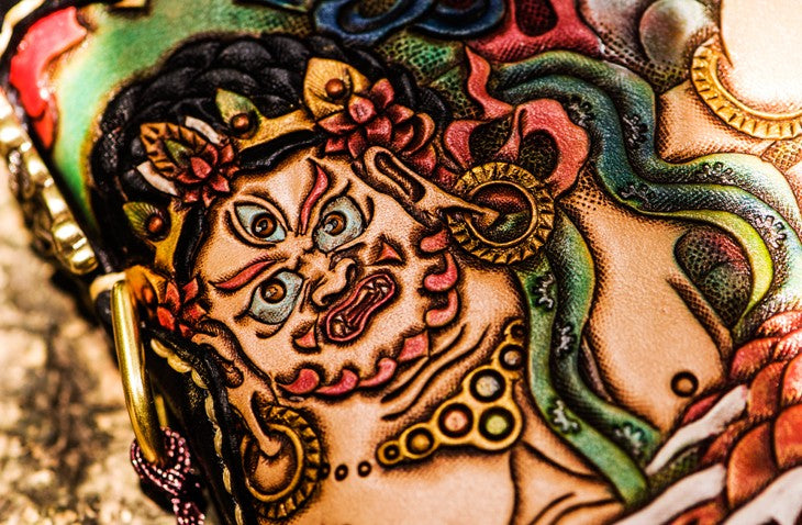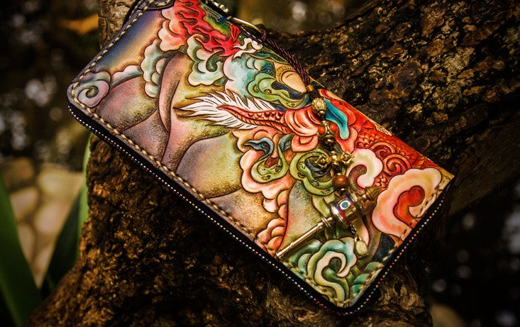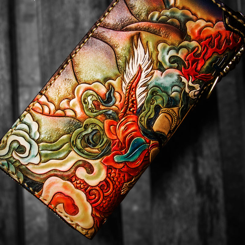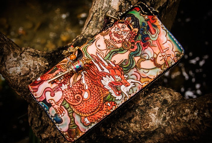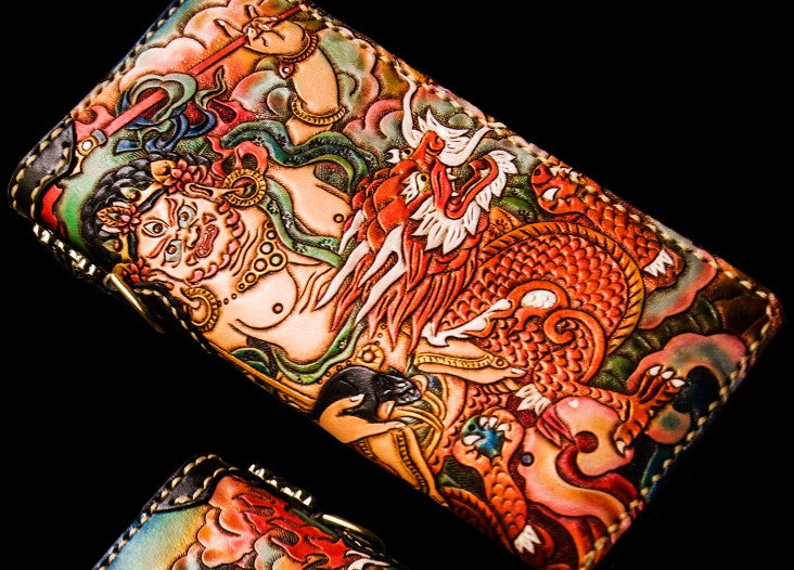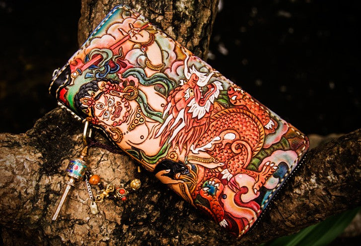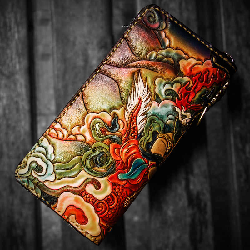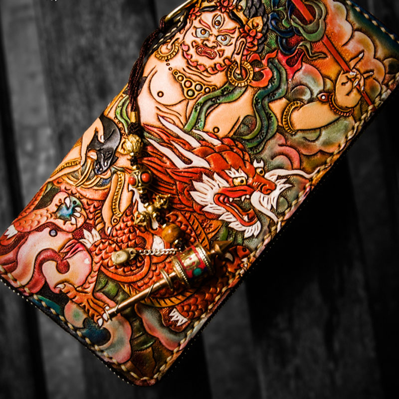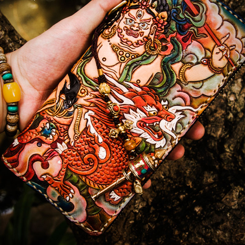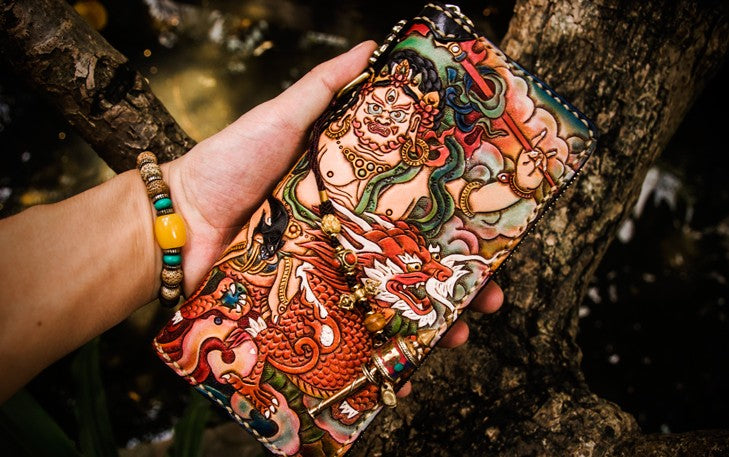 Design: Handmade Leather Tooled White Jambhala Mens Chain Biker Wallet Cool Leather Wallet Zipper Long Phone Wallets for Men