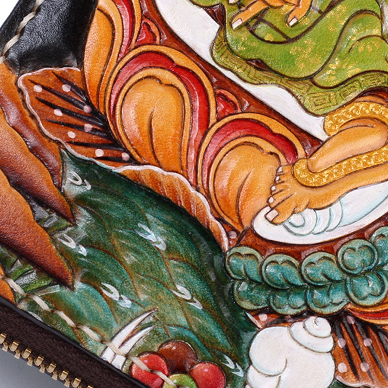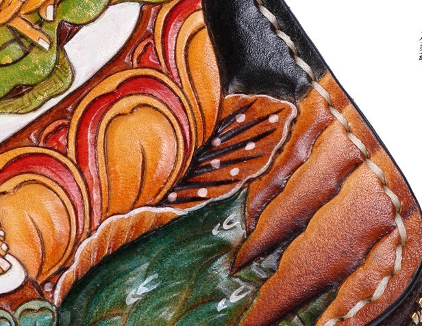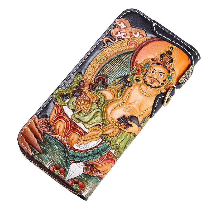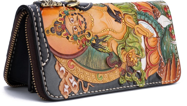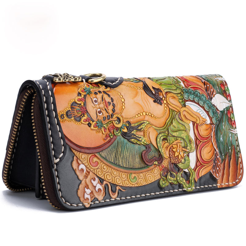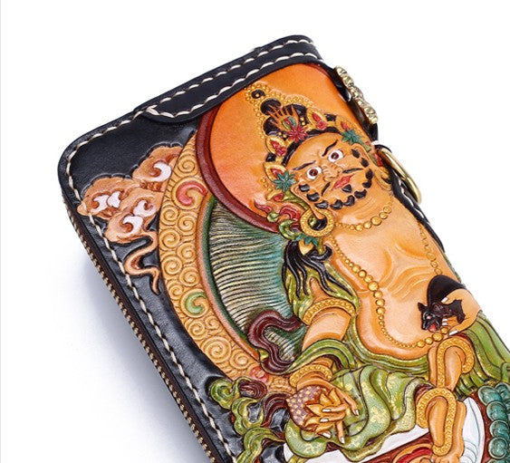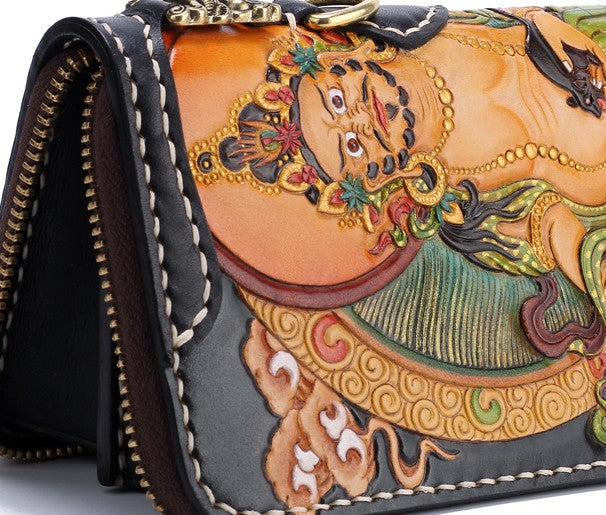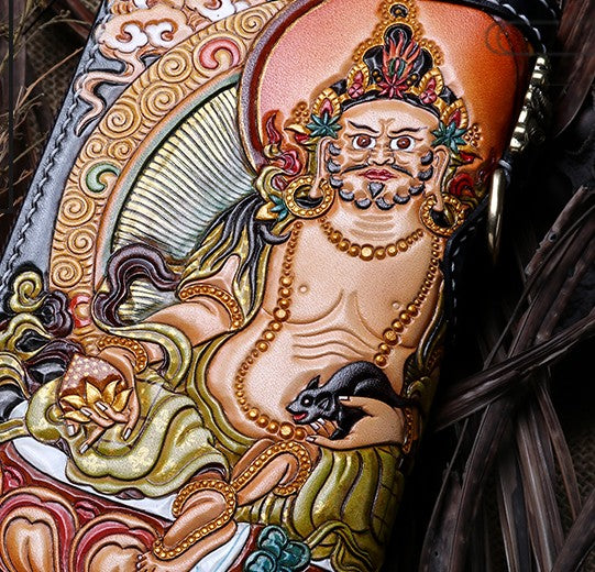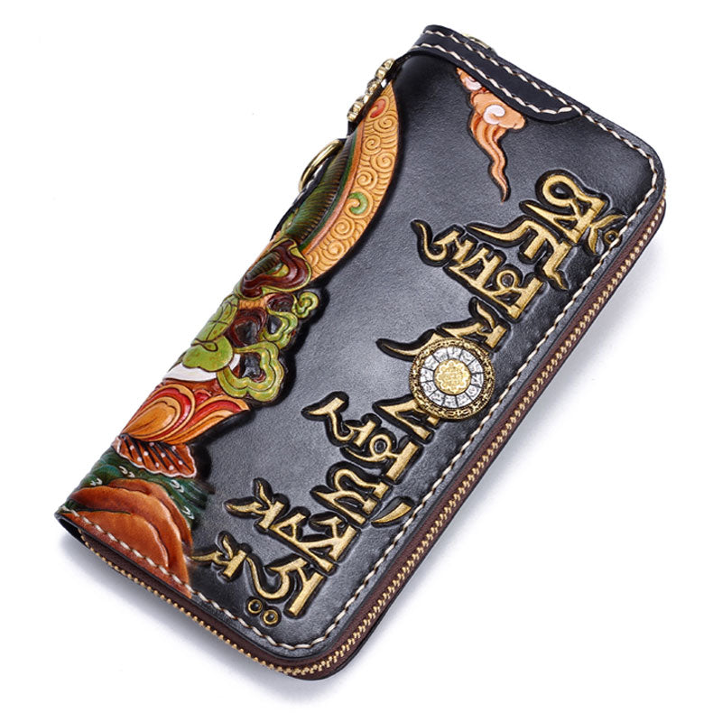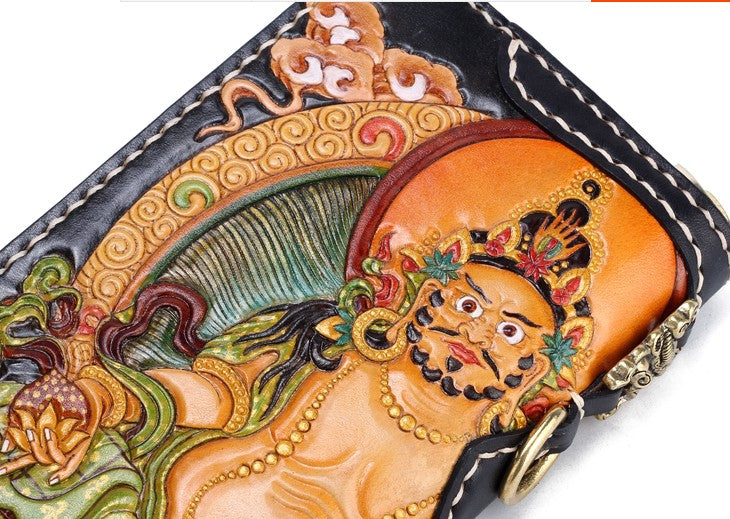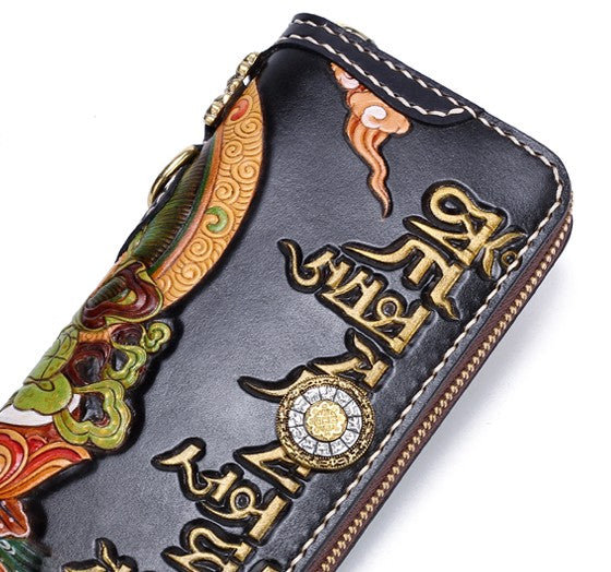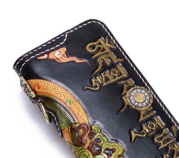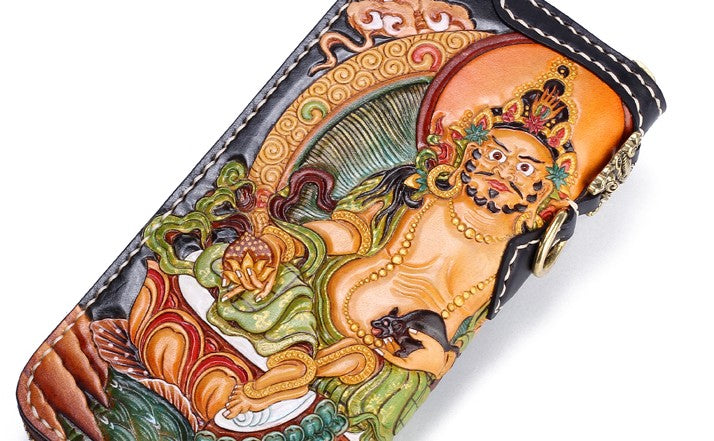 Design: Handmade Leather Tooled Yellow Jambhala Mens Chain Biker Wallet Cool Leather Wallet Zipper Long Phone Wallets for Men