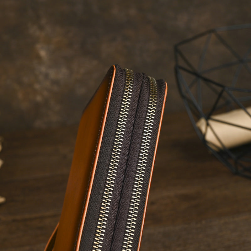 Discover the perfect fusion of rugged functionality and sophisticated organization with our premium Double Zip Around Wallet, expertly crafted for the modern man who demands both ample storage and refined style. This versatile Men's Leather Clutch measures 19.5cm x 9.5cm x 2.5cm, meticulously constructed from 100% full-grain leather in two rich, masculine shades—Classic Brown and Coffee Brown. Featuring a innovative double-zip main compartment with an accordion-style interior, this spacious Double Zip Around Wallet offers impressive capacity with 12 card slots, a secure zippered pocket, and 4 full bill compartments, making it the ideal choice for those who carry substantial daily essentials.