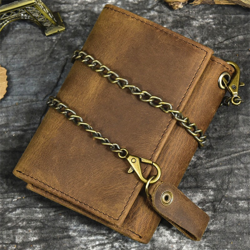 Design: Brown Leather Men's Biker Chain Wallet Vertical Trifold Biker Wallet with Chain For Men