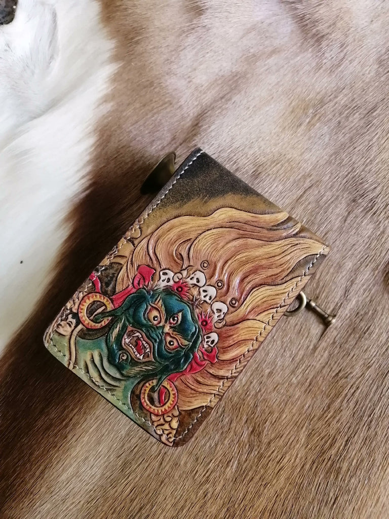 Design: Mahakala Wallet Tooled Leather Wallet Card Wallet with ID Window Mahakala Deity Wallet ID Holder Wallet Mens Wallet with ID Window