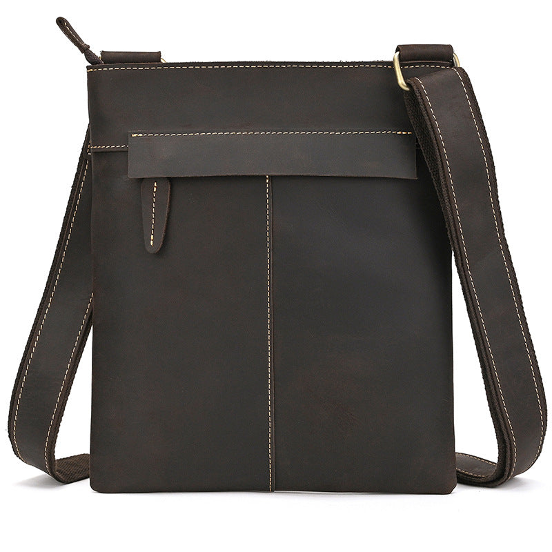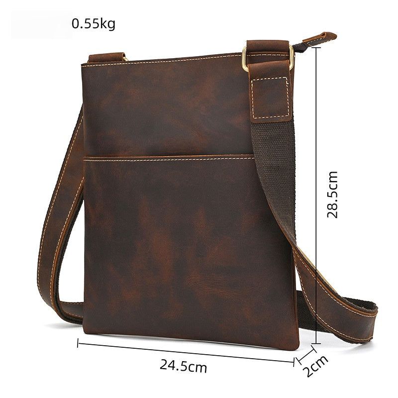 Discover the perfect blend of minimalist design and functional excellence with our men's vertical messenger bag. Expertly crafted from full-grain crazy horse leather, this sleek bag measures 24.5cm x 28.5cm x 2cm and weighs just 0.55kg, offering exceptional portability without compromising on style or security.