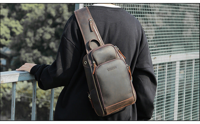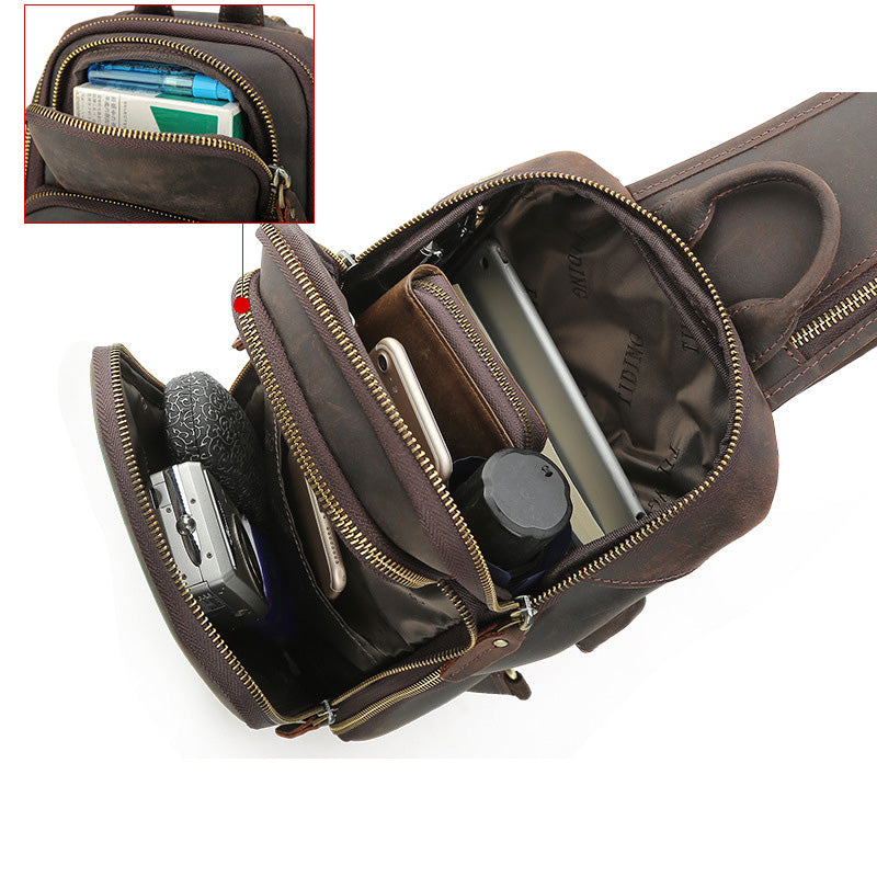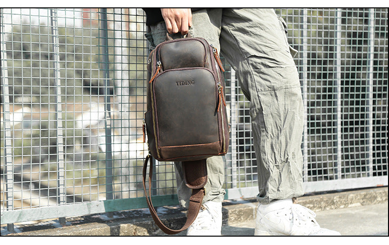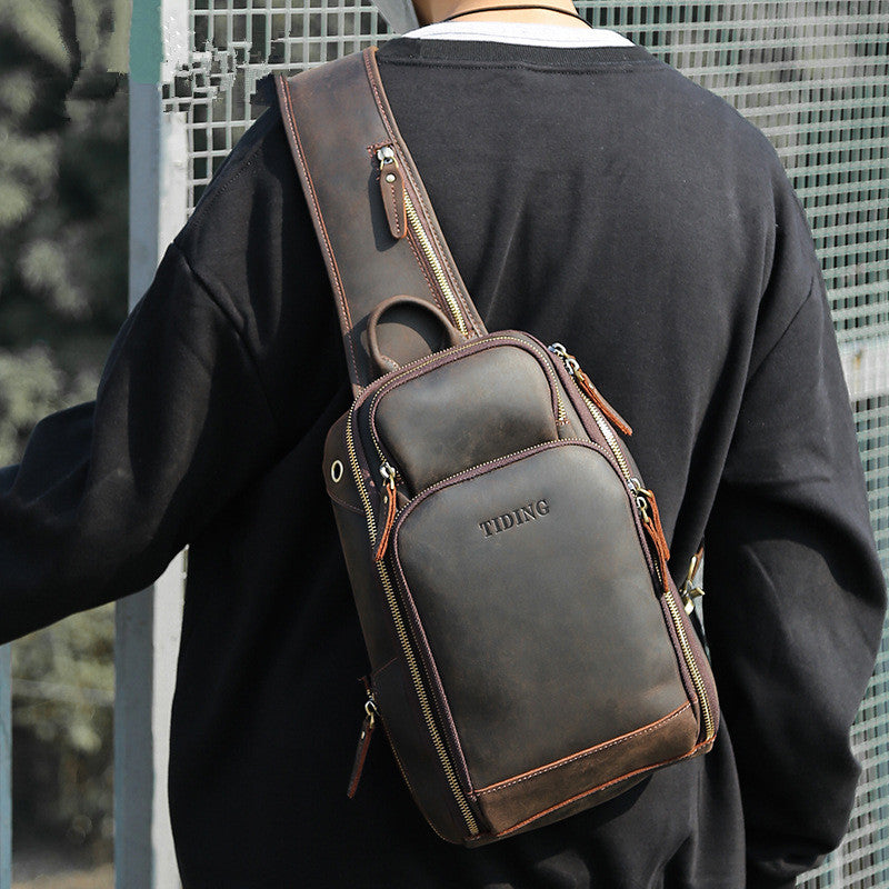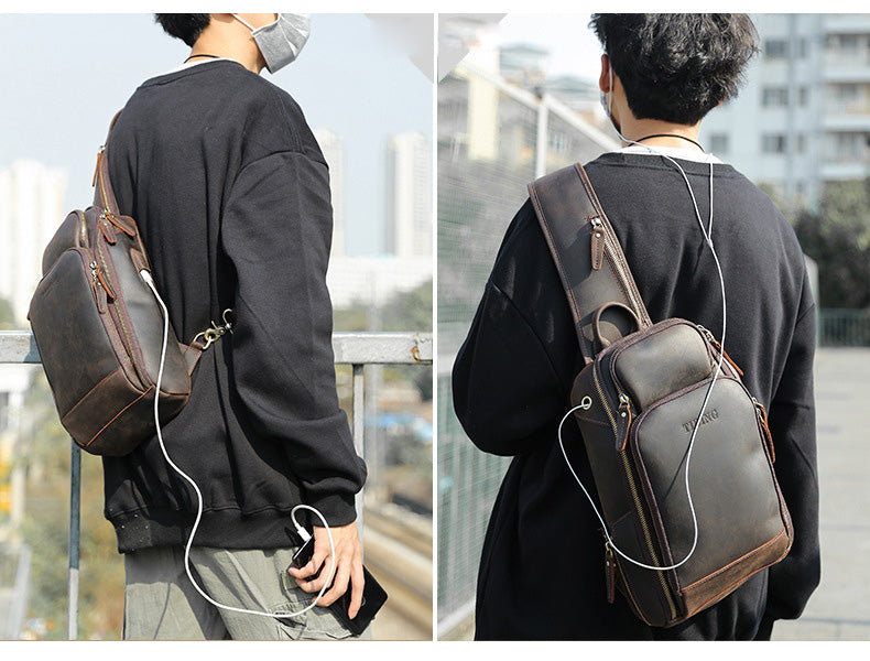 Design: Vintage Brown Leather Men's One Shoulder Backpack Chest Bag Sling Crossbody Pack For Men