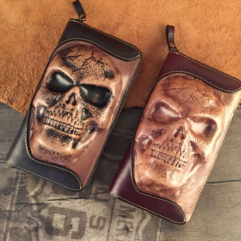 Design: Handmade Genuine Leather Mens Clutch Cool Long Wallet Skull Zipper Clutch Wristlet Wallet for Men