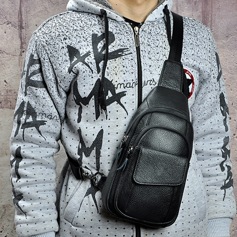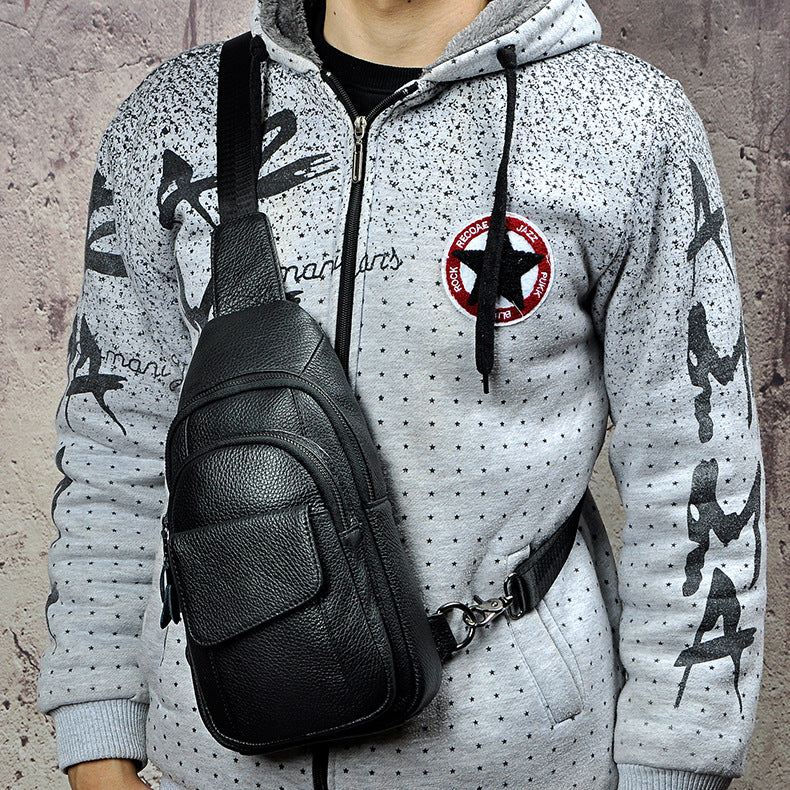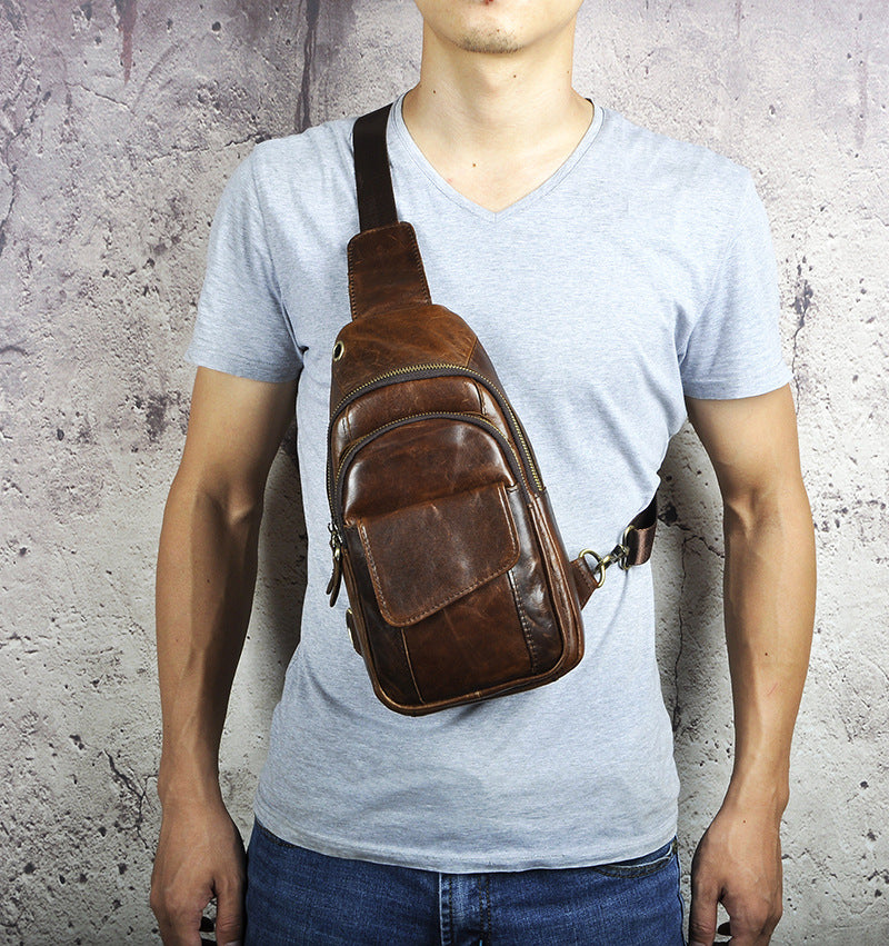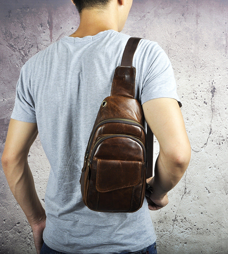 Design: Fashion Black Leather Men's Sling Bag Chest Bag Brown One Shoulder Backpack For Men