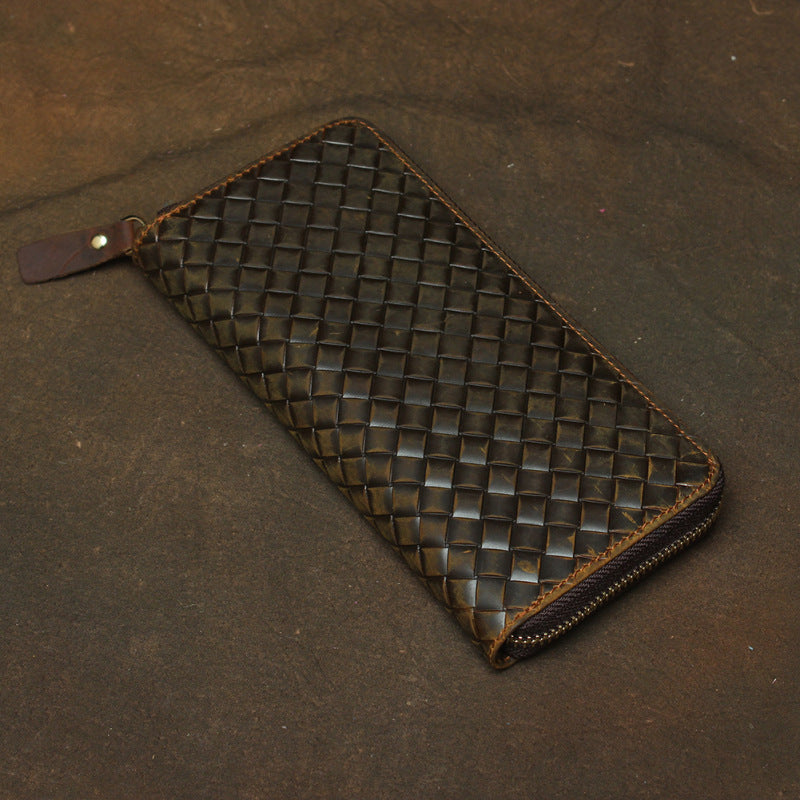 Style: Vintage Braided Brown Leather Men's Clutch Long Wallet Zipper Long Wallet For Men