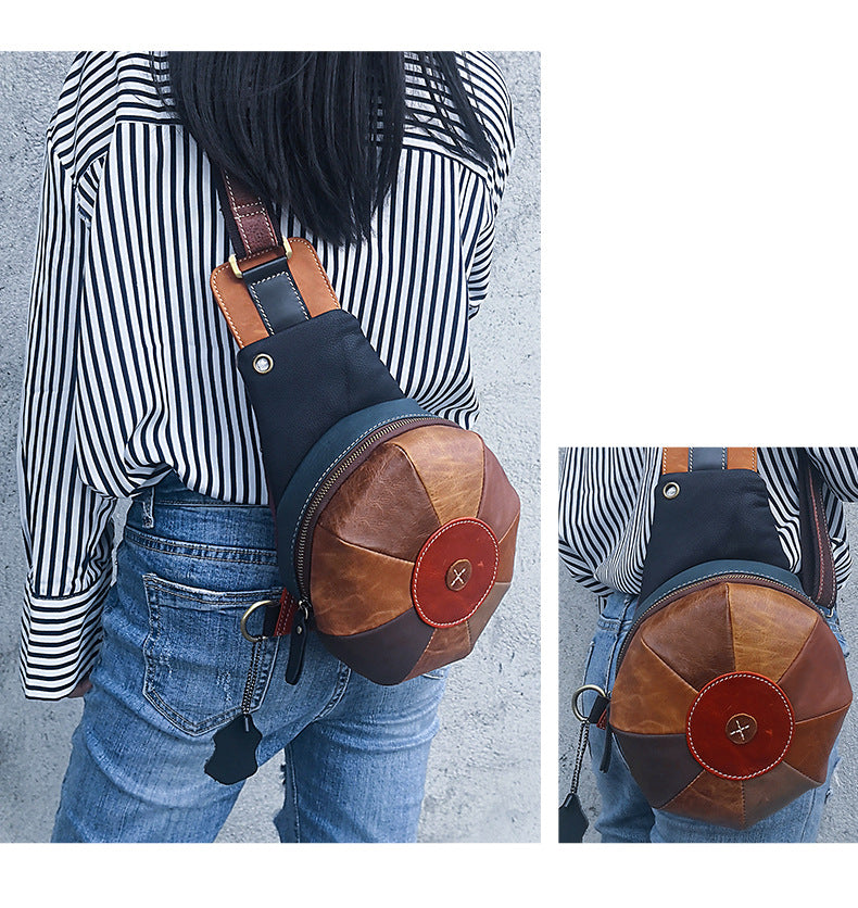 Design: Stitched Brown Leather Men's Sling Bag Shoulder Bag Chest Bag One Shoulder Backpack For Men
