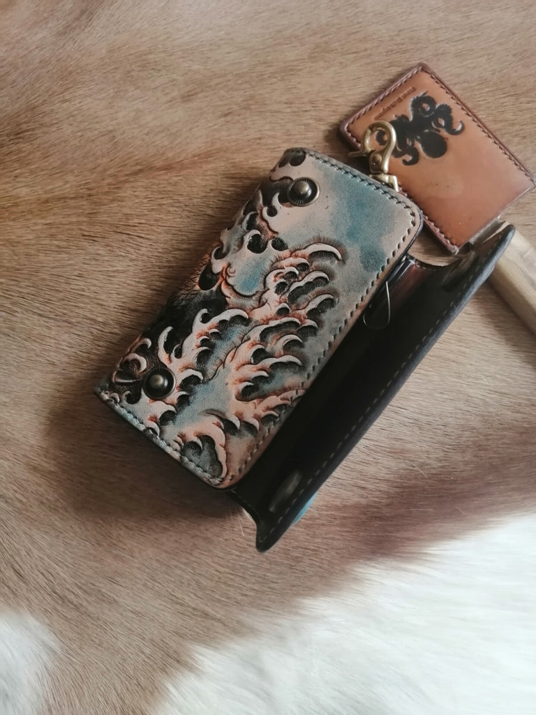 Whether you’re a leather enthusiast, a lover of handcrafted goods, or simply seeking a stylish solution to key clutter, our Tooled Leather Key Wallet with Card Holder and the symbolic yellow carp design is a perfect choice. It’s not just an accessory; it’s a blend of art, culture, and utility, measuring 11cm x 5.5cm x 3cm to fit seamlessly into your daily life, accompanying you with elegance every day.