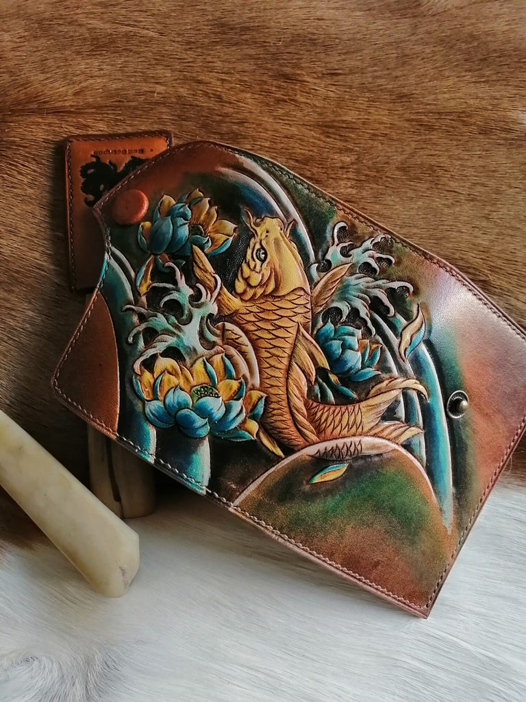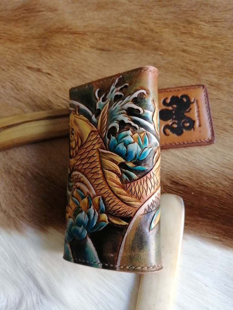 At the heart of its charm is the intricate tooled leather artistry. The surface showcases a vivid yellow carp, a symbol of good fortune and perseverance in many cultures, surrounded by delicately tooled floral motifs. Each detail is painstakingly carved by skilled artisans, bringing the leather to life with rich textures and a three - dimensional allure. The warm, earthy tones of the leather, enhanced by careful dyeing, create a harmonious backdrop for the vibrant yellow carp, making every wallet one - of - a - kind.