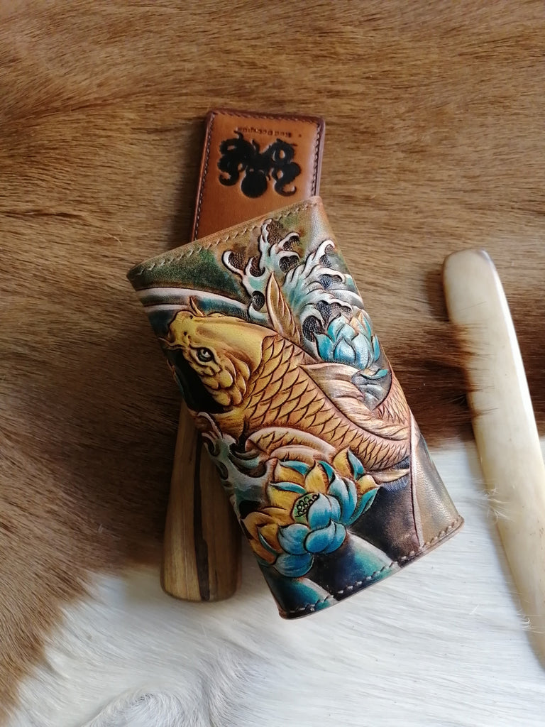 Whether you’re a leather enthusiast, a lover of handcrafted goods, or simply seeking a stylish solution to key clutter, our Tooled Leather Key Wallet with Card Holder and the symbolic yellow carp design is a perfect choice. It’s not just an accessory; it’s a blend of art, culture, and utility, measuring 11cm x 5.5cm x 3cm to fit seamlessly into your daily life, accompanying you with elegance every day.