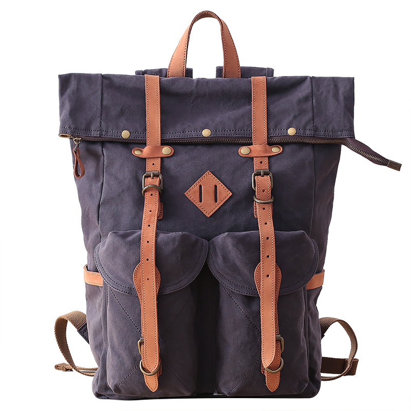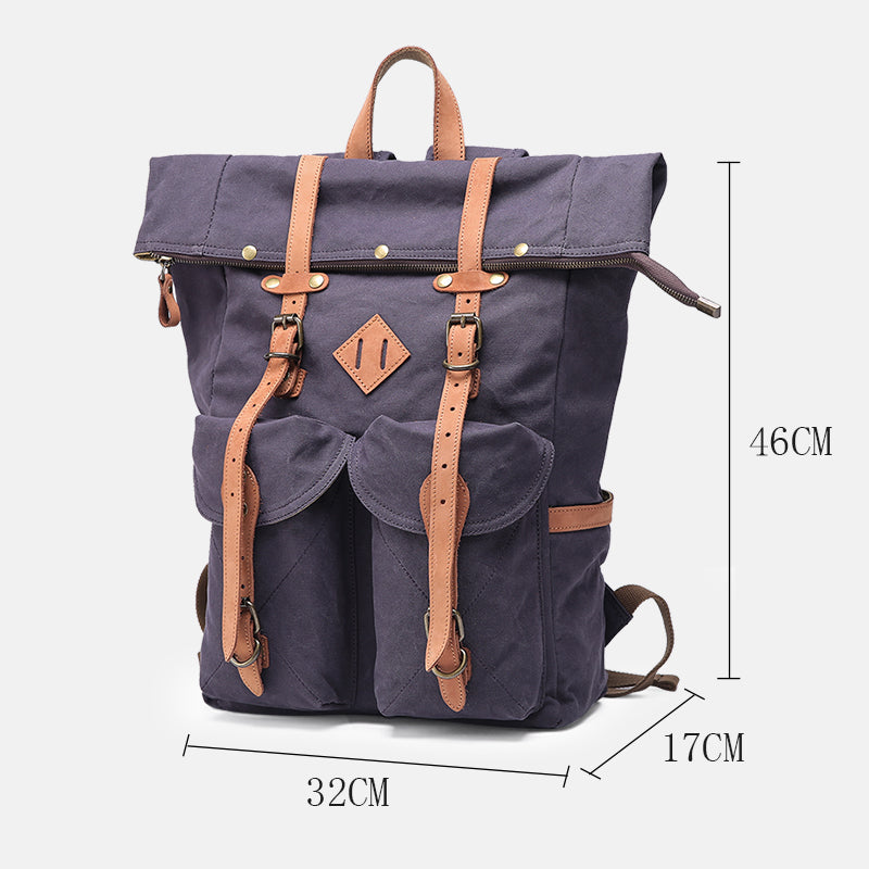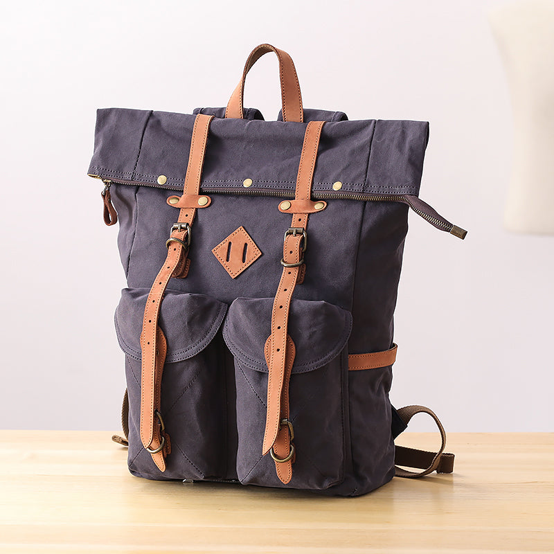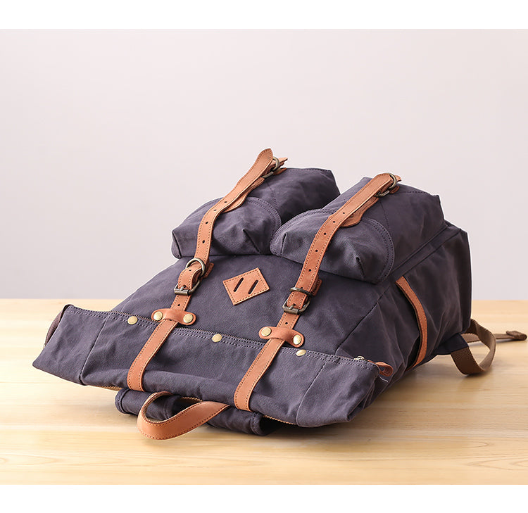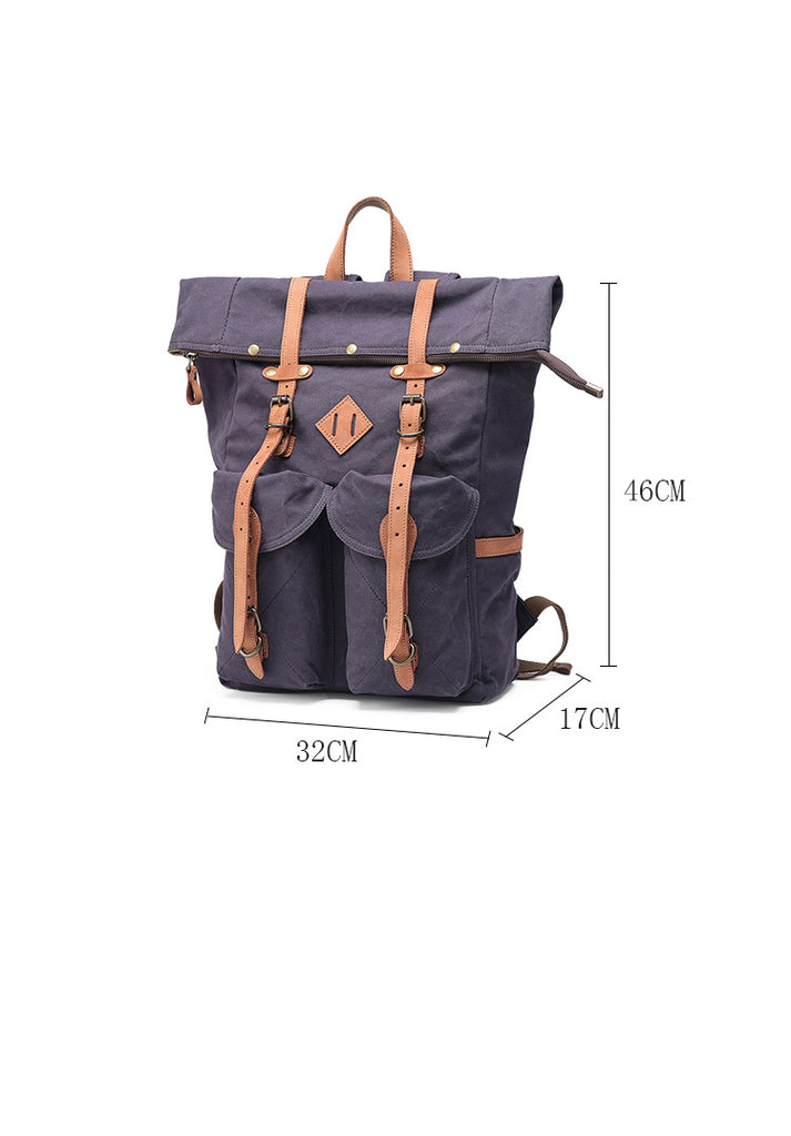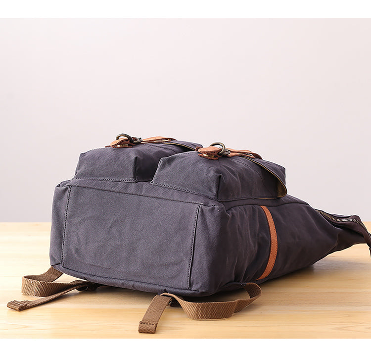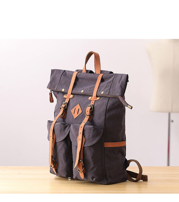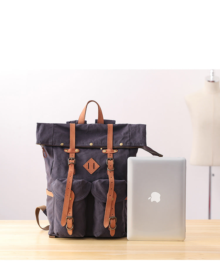 Design: Waxed Canvas Leather Mens Dark Gray Waterproof 15‘’ Large Backpack Travel Backpack College Backpack for Men