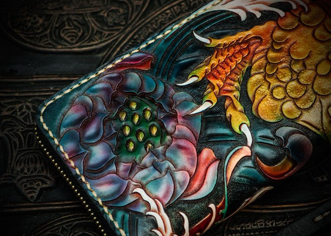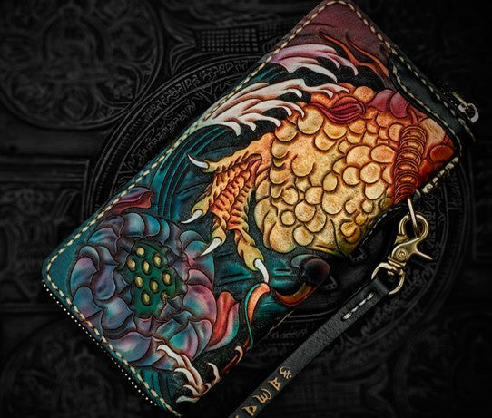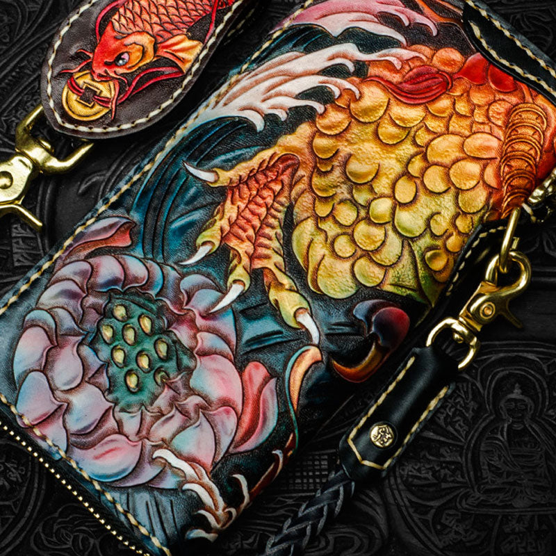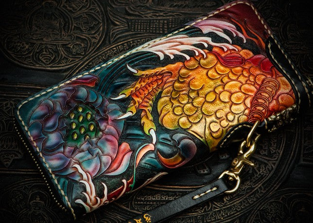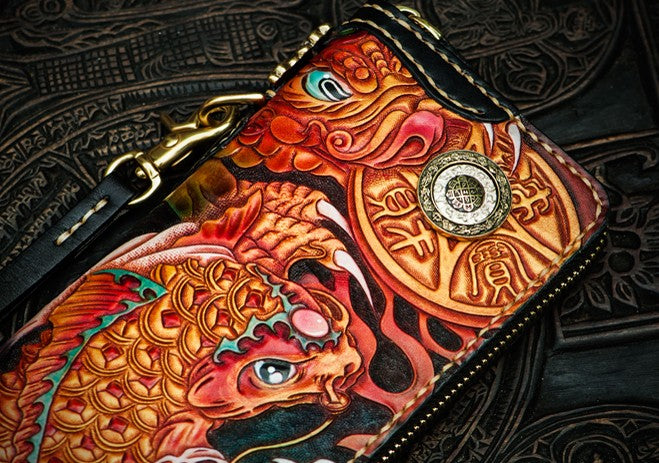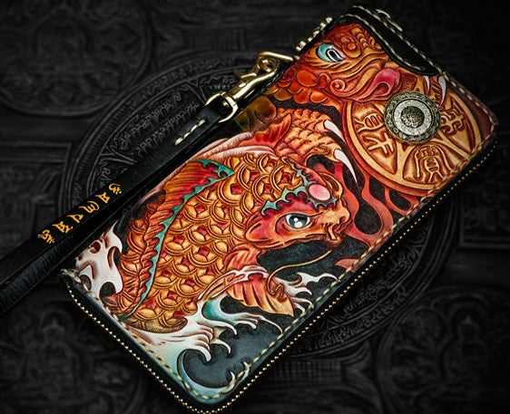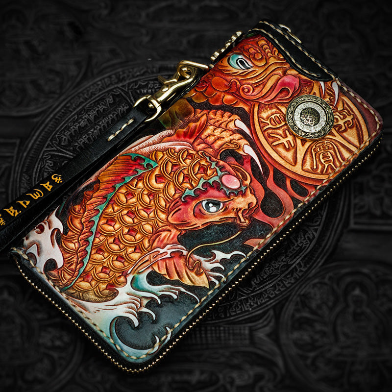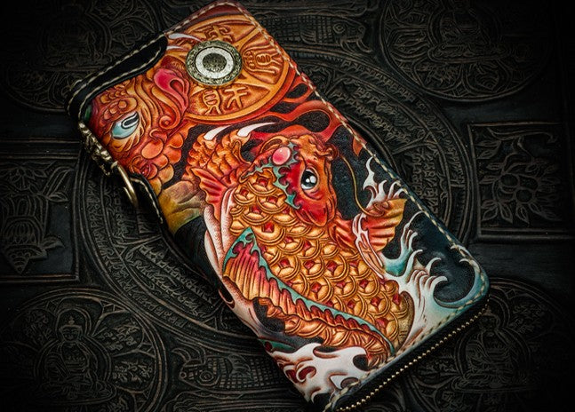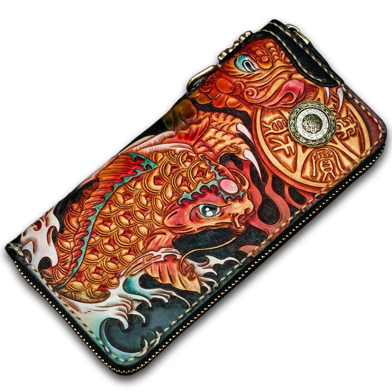Design: Handmade Leather Tooled Carp Mens Chain Biker Wallet Cool Leather Wallet Long Phone Wallets for Men