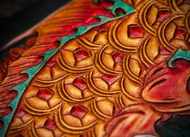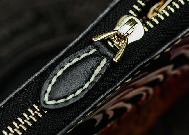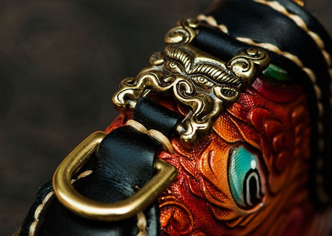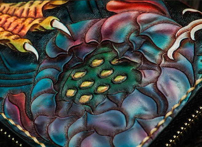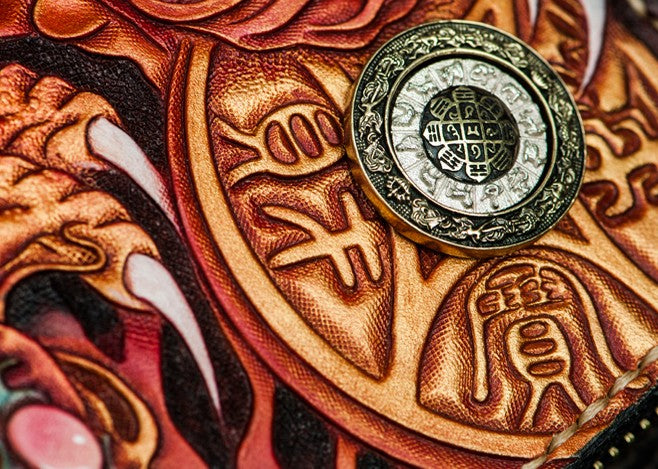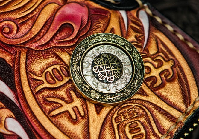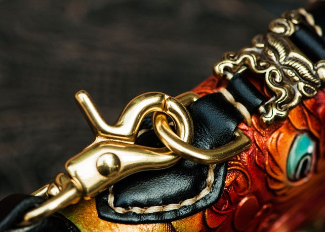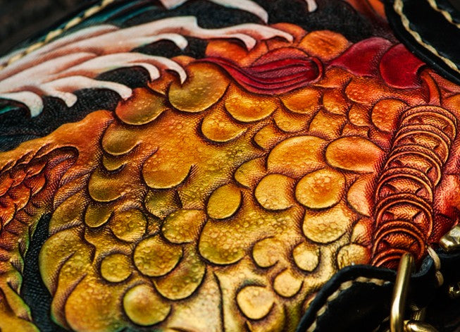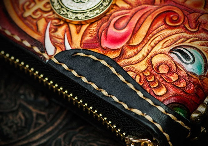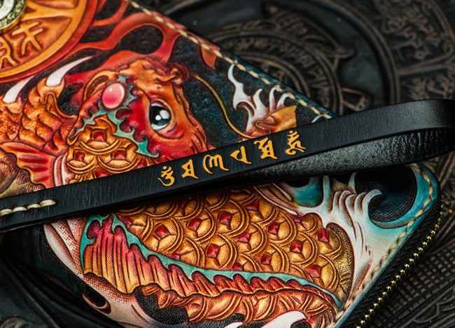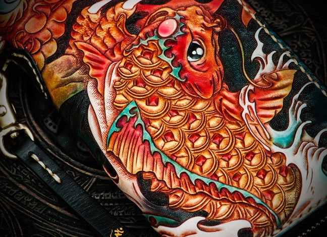 Design: Handmade Leather Tooled Carp Mens Chain Biker Wallet Cool Leather Wallet Long Phone Wallets for Men