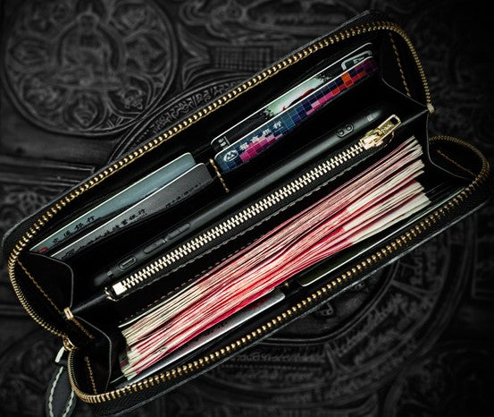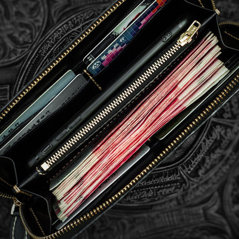 Handmade Leather Tooled Carp Mens Chain Biker Wallet Cool Leather Wallet Long Phone Wallets for Men