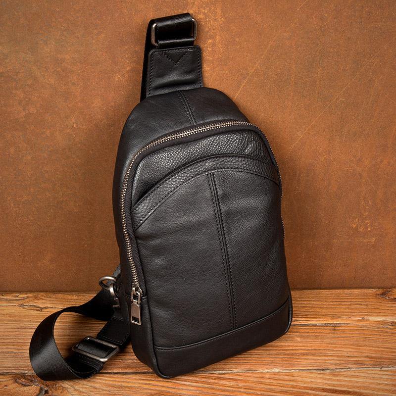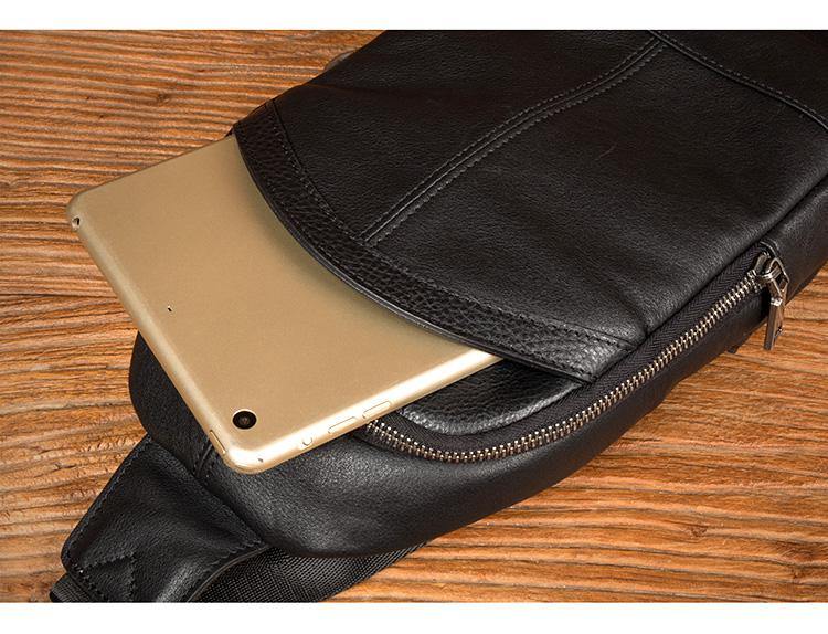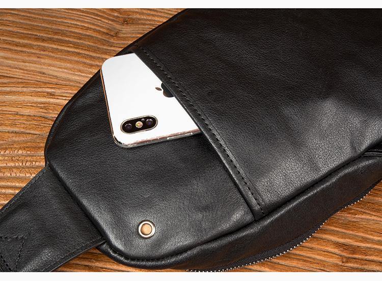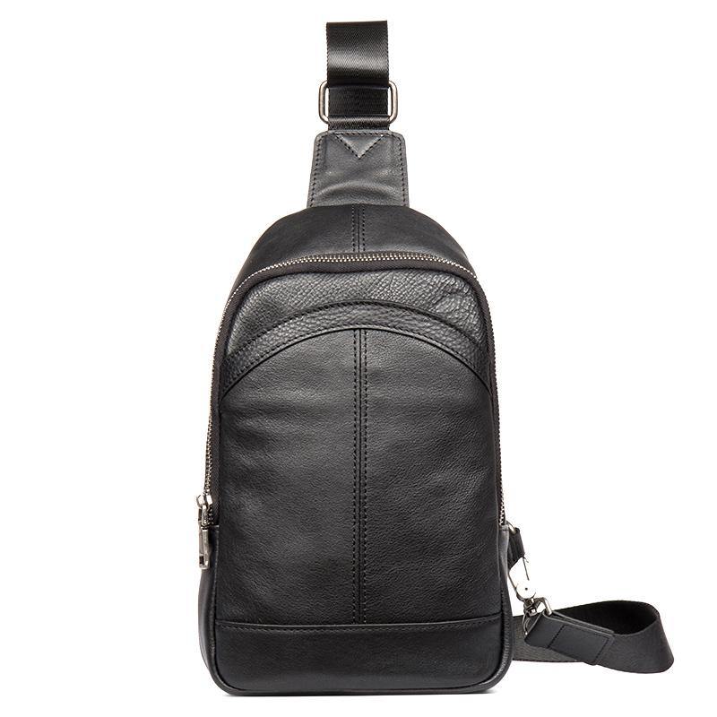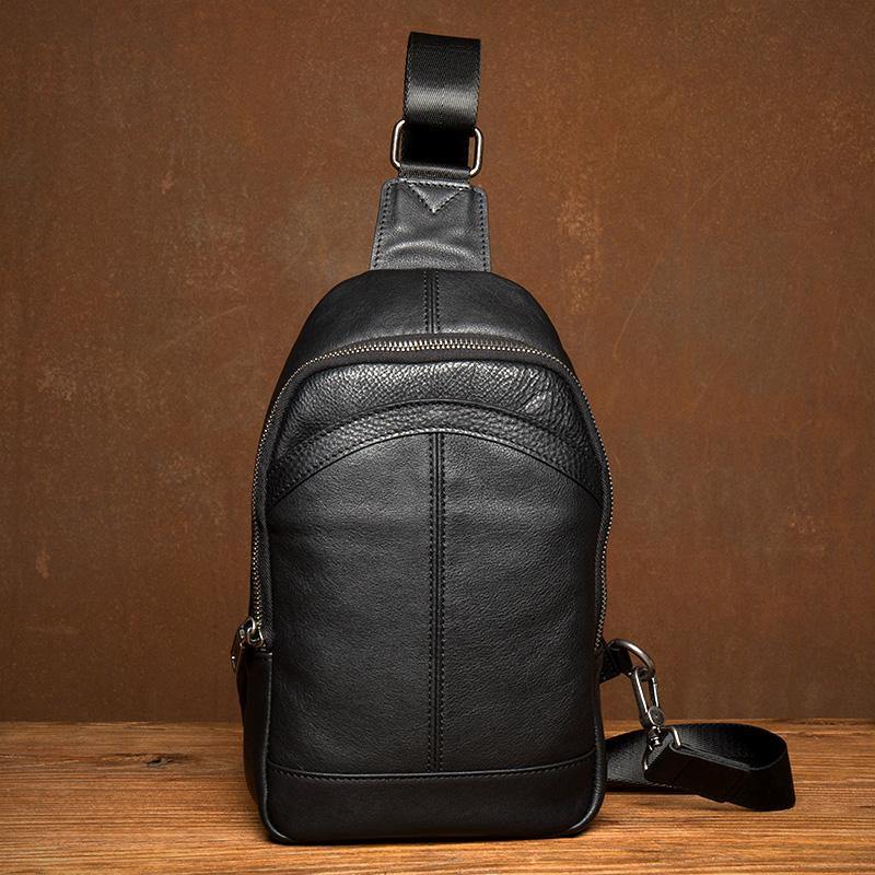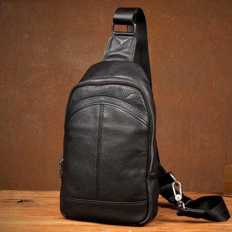 Design: Black Leather Mens 8 inches Cool Sling Bag Crossbody Bag Chest Bag for men