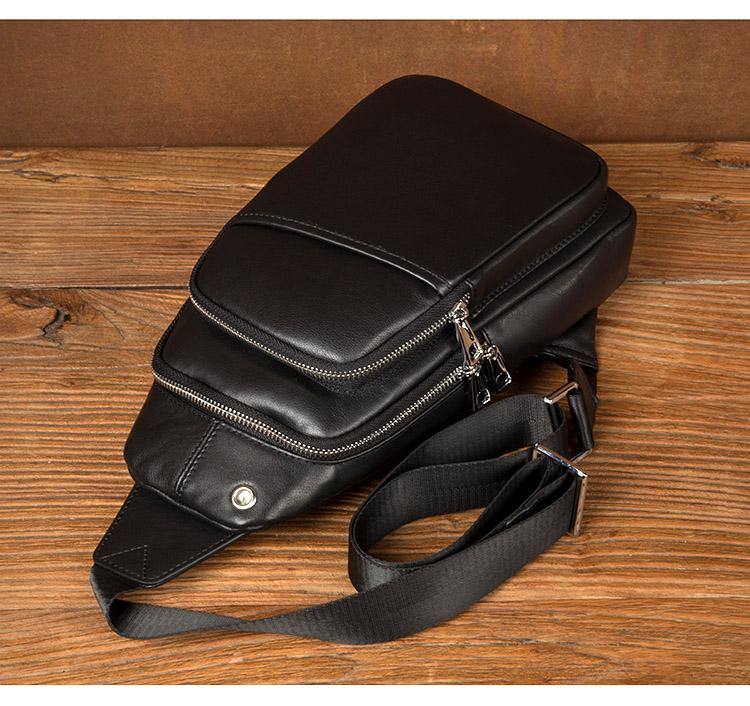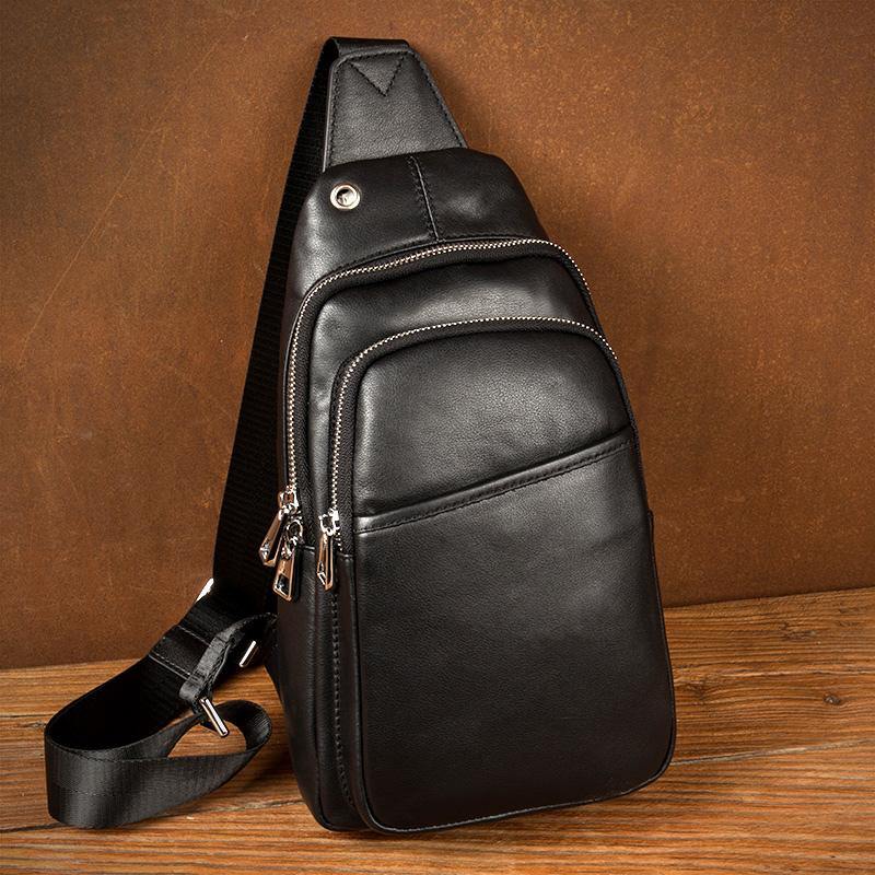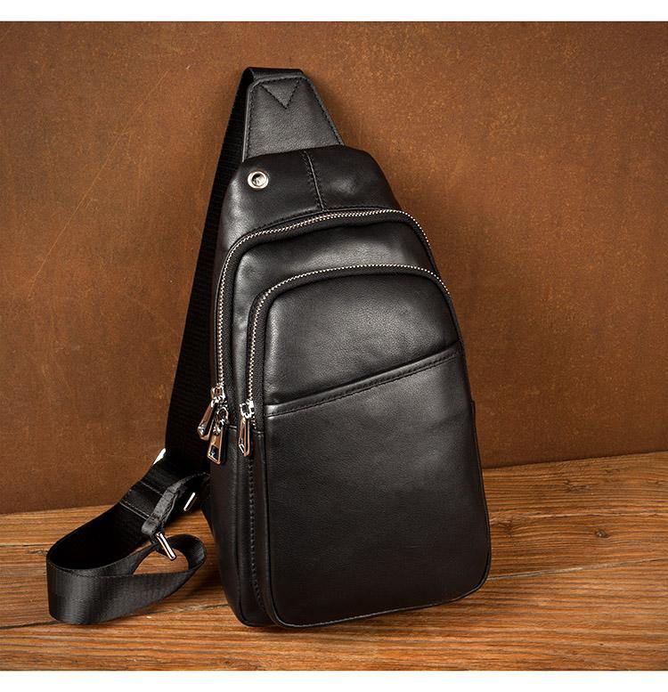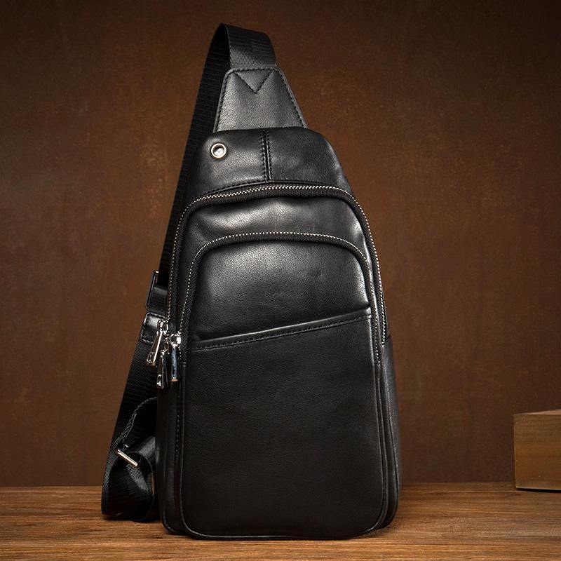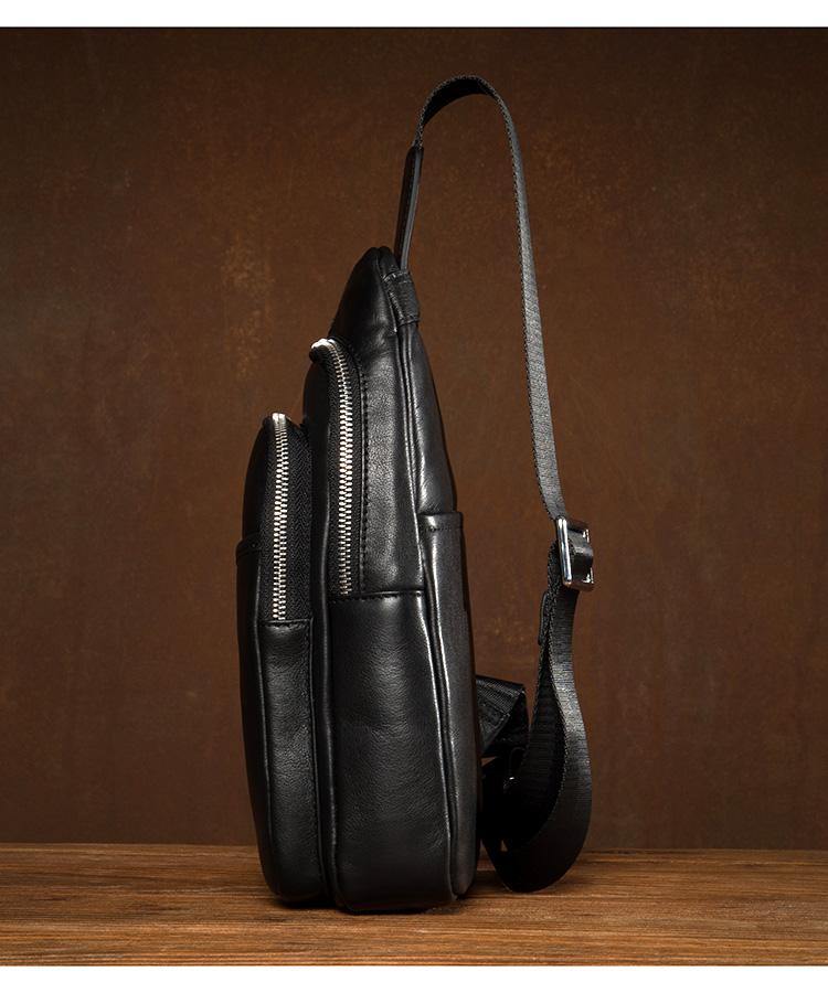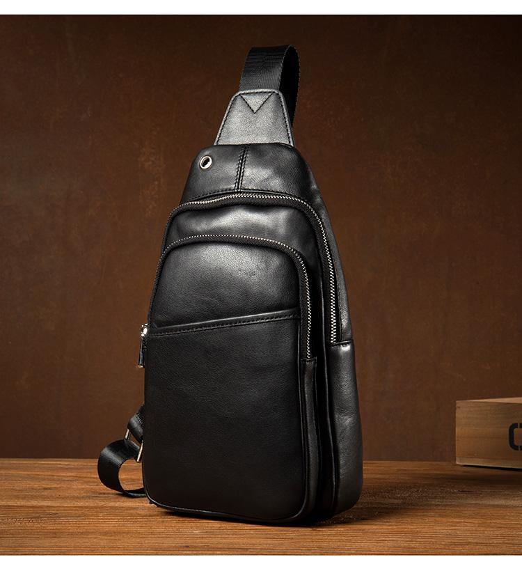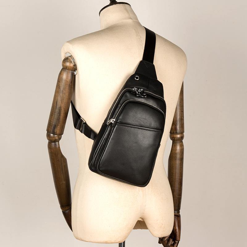 Design: Black Leather Mens 8 inches Cool Sling Bag Crossbody Bag Chest Bags for men