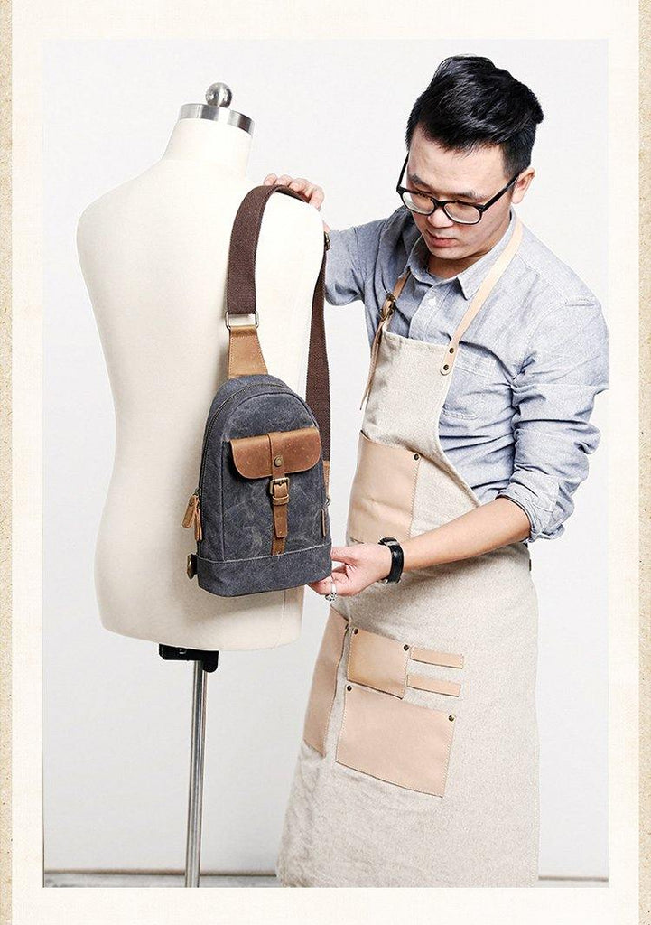Design: Cool Canvas Leather Mens 8 inches Black Chest Bag Shoulder Bag Crossbody Bag For Men