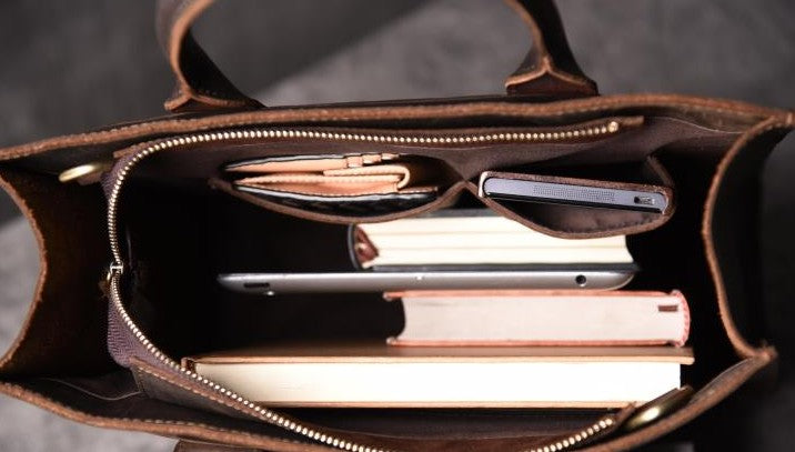Slots: 1 zipper slot, 1 book slot, 3 wallet slots, 1 phone slot