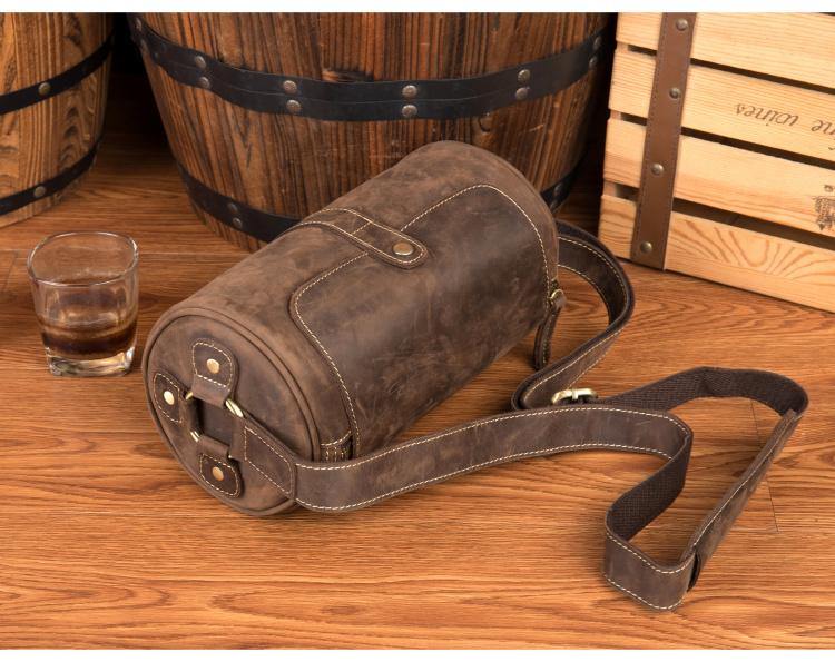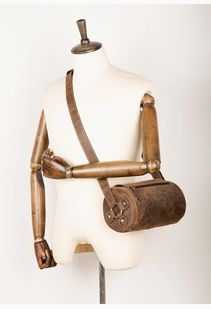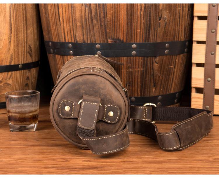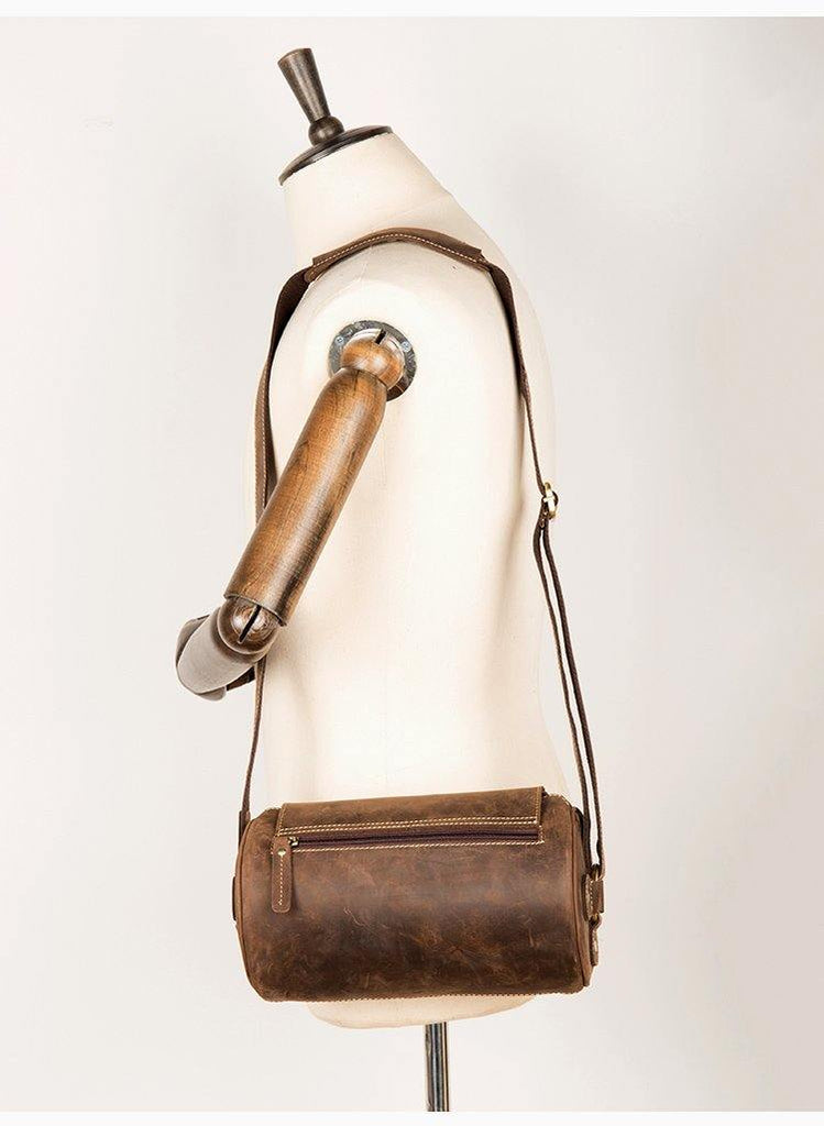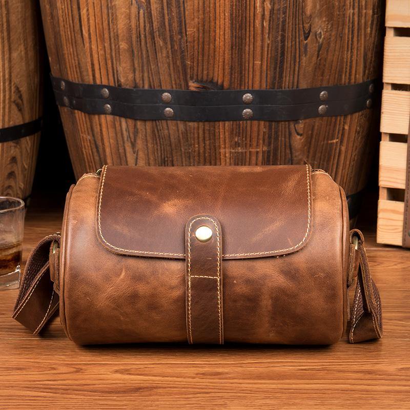 Cool Mens Brown Leather Small Barrel Messenger Bag Bucket Courier Bags for Men