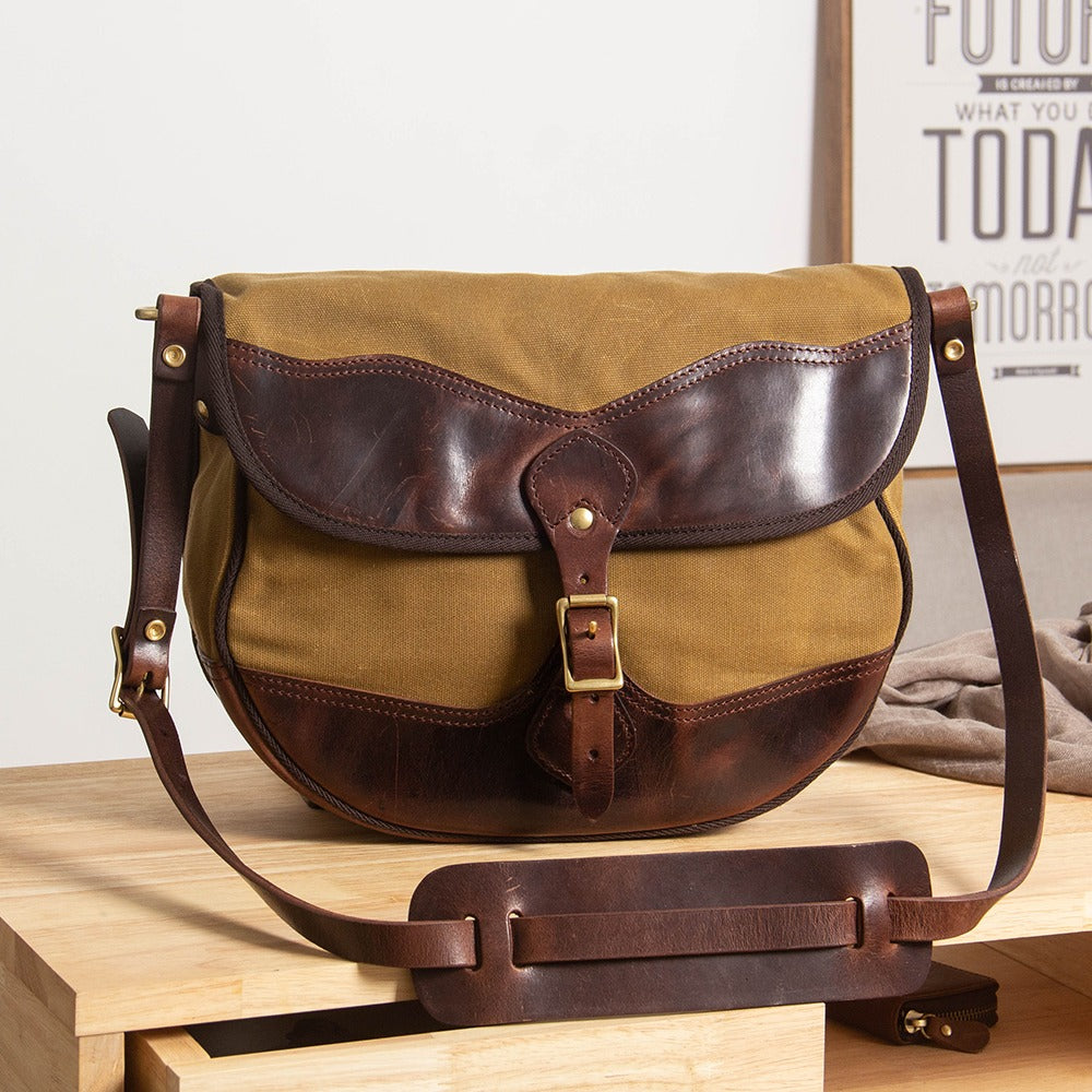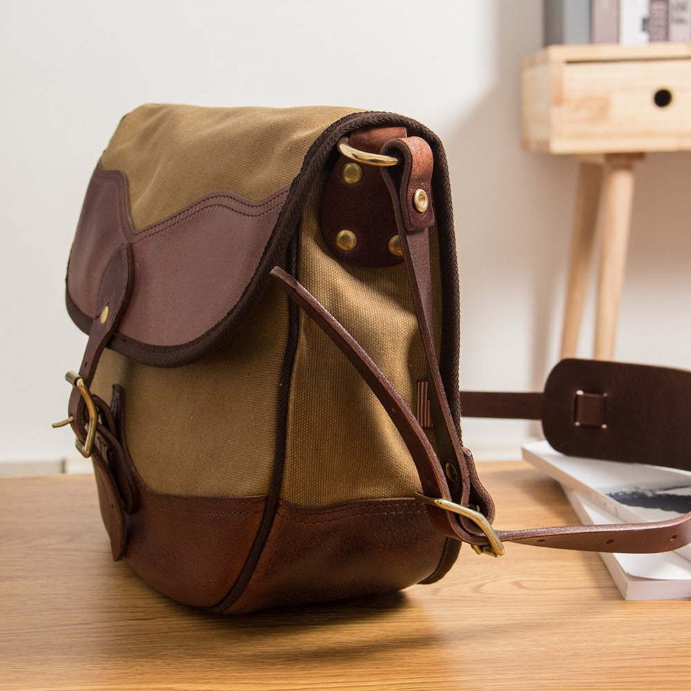 Style: Mens Khaki Canvas Leather Saddle Side Bag Saddle Messenger Bag For Men