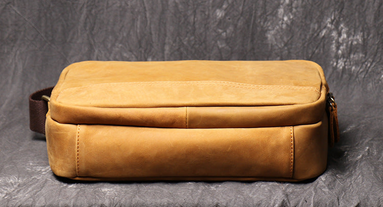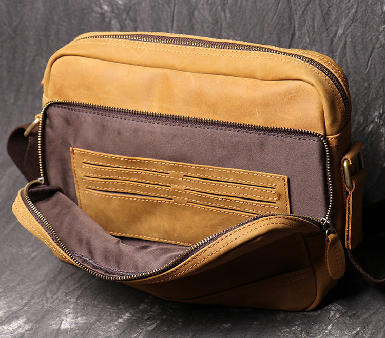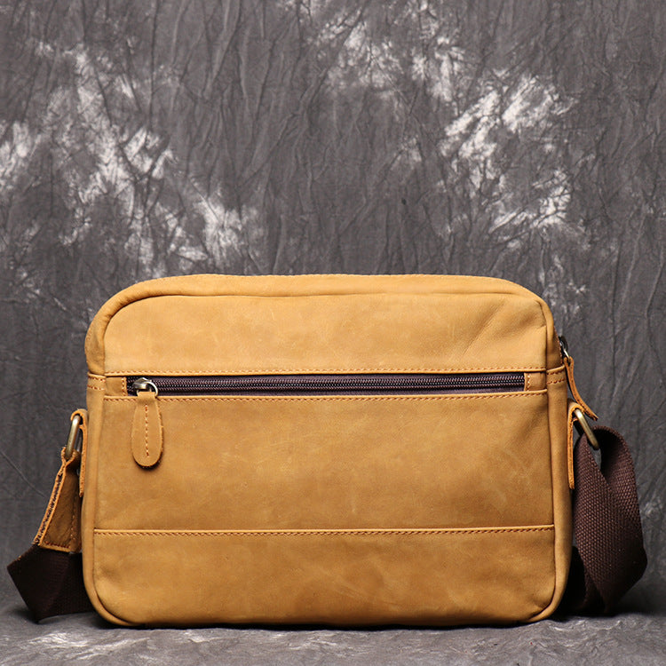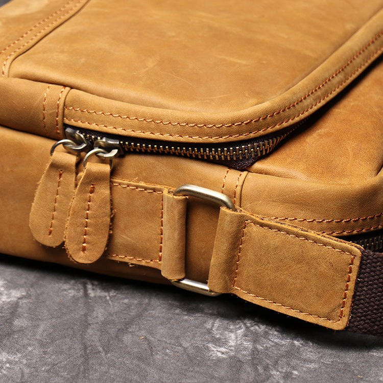 Design: Simple Yellow Brown Leather Men's Vertical Side Bag 10inch Vertical Messenger Bag For MenOverview: