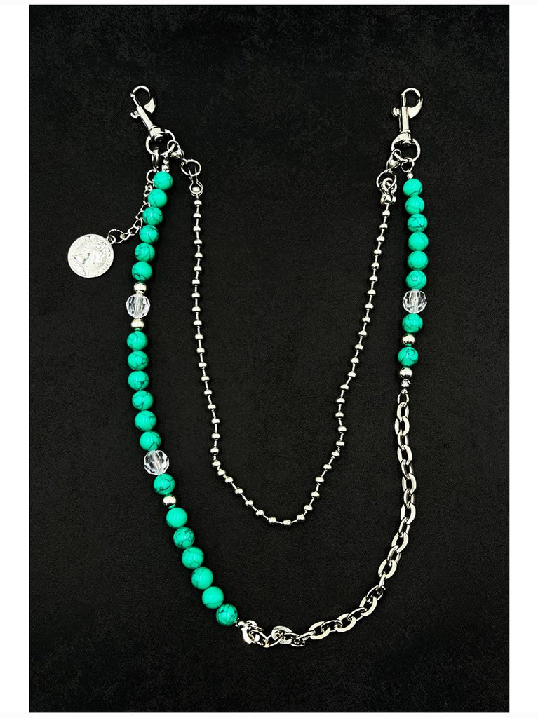 Introducing a bold fusion of earthy elegance and urban edge with our Beaded Wallet Chain, a masterfully designed accessory that makes a statement through its rich textures and layered dimensions. This unique Double Wallet Chain features a striking 65cm outer strand composed of genuine red striped turquoise beads, alloy chain links, and sparkling crystal accents, artfully arranged in an asymmetrical, mixed-material composition. Paired with a sleek 40cm inner strand of fine alloy beads, this versatile Ball Wallet Chain creates a captivating visual dialogue between organic stones, industrial metal, and delicate sparkle. The design is elevated with a distinctive circular coin charm near the clasp, adding a final touch of symbolic depth and vintage character.
