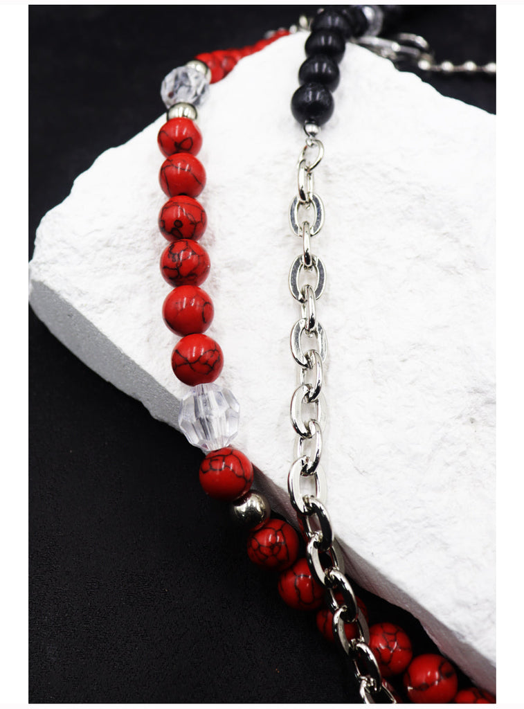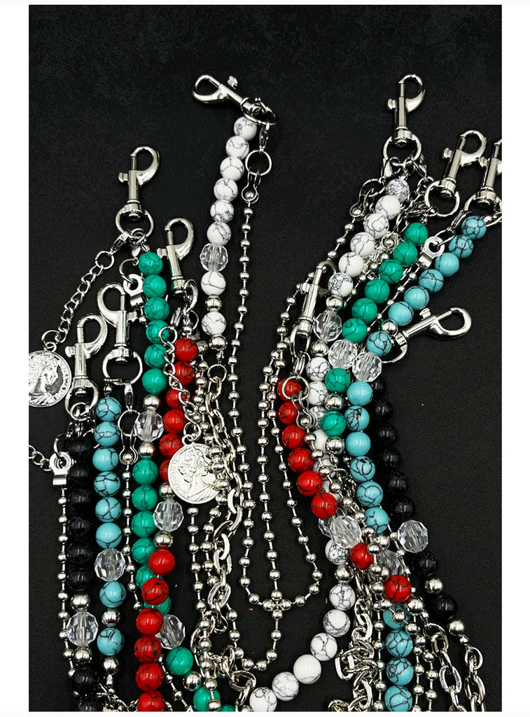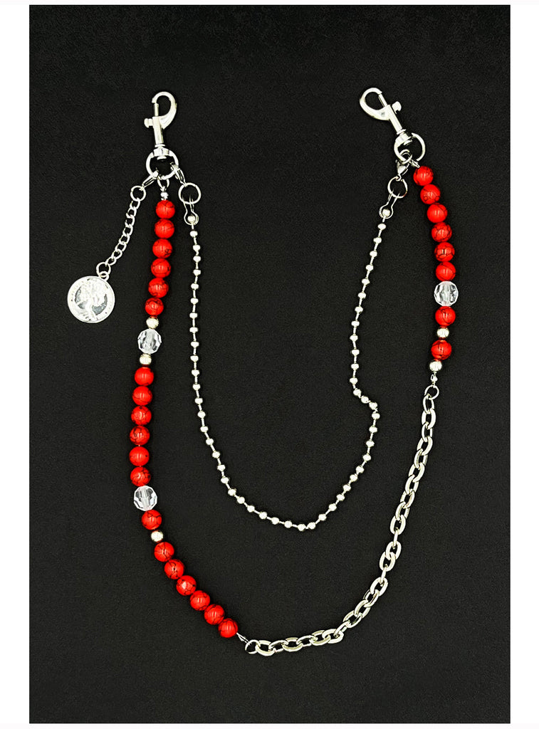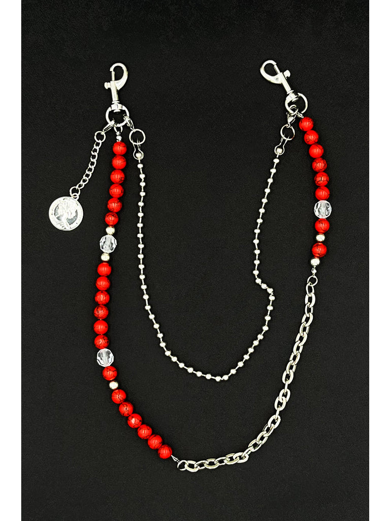 Introducing a bold fusion of earthy elegance and urban edge with our Beaded Wallet Chain, a masterfully designed accessory that makes a statement through its rich textures and layered dimensions. This unique Double Wallet Chain features a striking 65cm outer strand composed of genuine red striped turquoise beads, alloy chain links, and sparkling crystal accents, artfully arranged in an asymmetrical, mixed-material composition. Paired with a sleek 40cm inner strand of fine alloy beads, this versatile Ball Wallet Chain creates a captivating visual dialogue between organic stones, industrial metal, and delicate sparkle. The design is elevated with a distinctive circular coin charm near the clasp, adding a final touch of symbolic depth and vintage character.