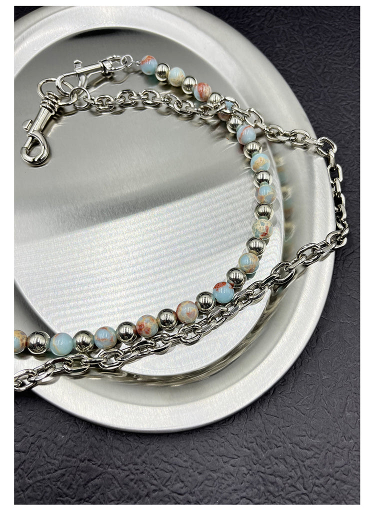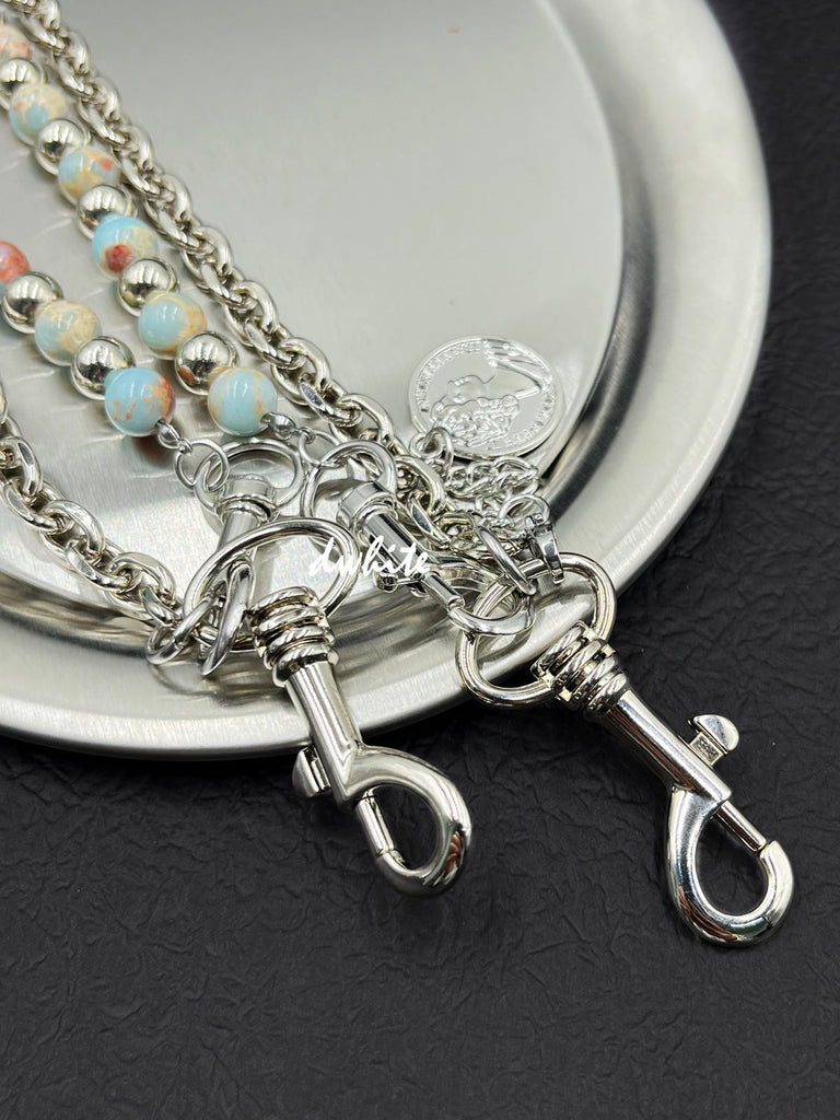 Introducing a refreshing and versatile fusion of industrial strength and serene natural beauty with our Beaded Wallet Chain, a masterfully designed accessory that redefines modular styling. This innovative Double Wallet Chain features a substantial 71cm outer chain of rugged alloy links paired with a 50cm shorter strand of genuine light blue multicolored Shoushan stone and polished metal beads. The true standout is its detachable design: the shorter stone-adorned chain comes equipped with connectors at both ends, allowing it to be worn independently as a statement piece or seamlessly connected to the longer chain to create a layered Ball Wallet Chain ensemble. Adding the final touch of character, a distinctive circular coin charm hangs near the clasp, creating a look that is both symbolic and street-savvy.