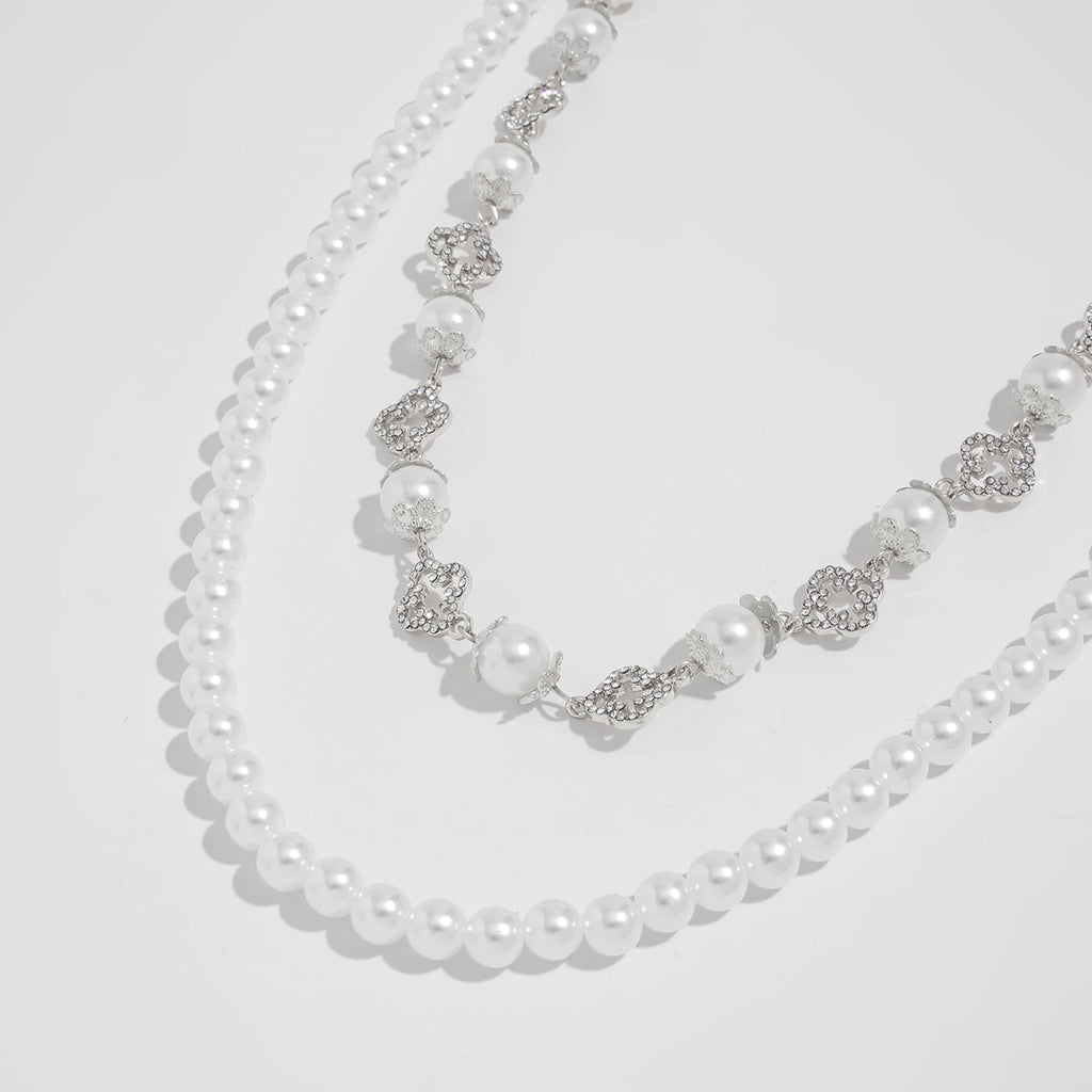 Style Tip: For a balanced look, wear the longer pearl strand as the base and let the shorter openwork floral-accented chain layer over it for maximum visual impact.