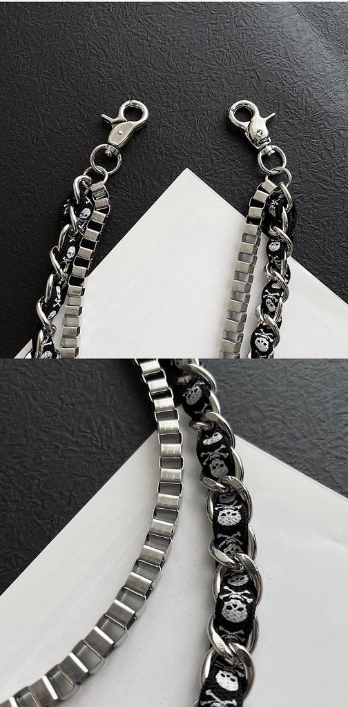 Introducing the Double Link Wallet Chain, a bold fusion of industrial toughness and graphic edge. This distinctive Skull Wallet Chain features a 54cm outer chain crafted from classic alloy links, uniquely interwoven with a black canvas strip adorned with a repeating white skull print. The 41cm inner chain is composed of lightweight, folded metal links, offering a slim profile and reduced weight without sacrificing durability. Together, they form a versatile Double Wallet Chain that balances statement-making design with everyday wearability, perfectly suited for those who dare to stand out.