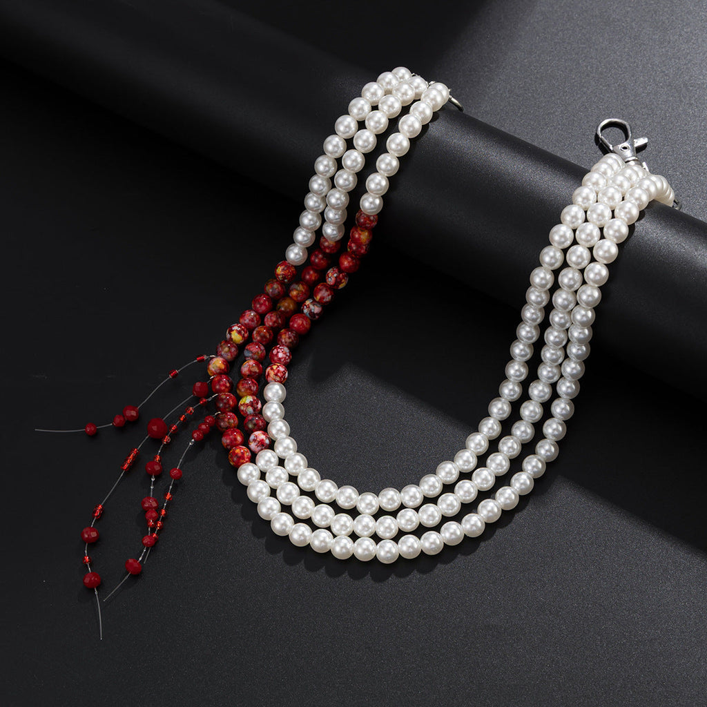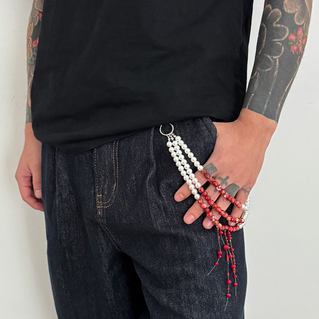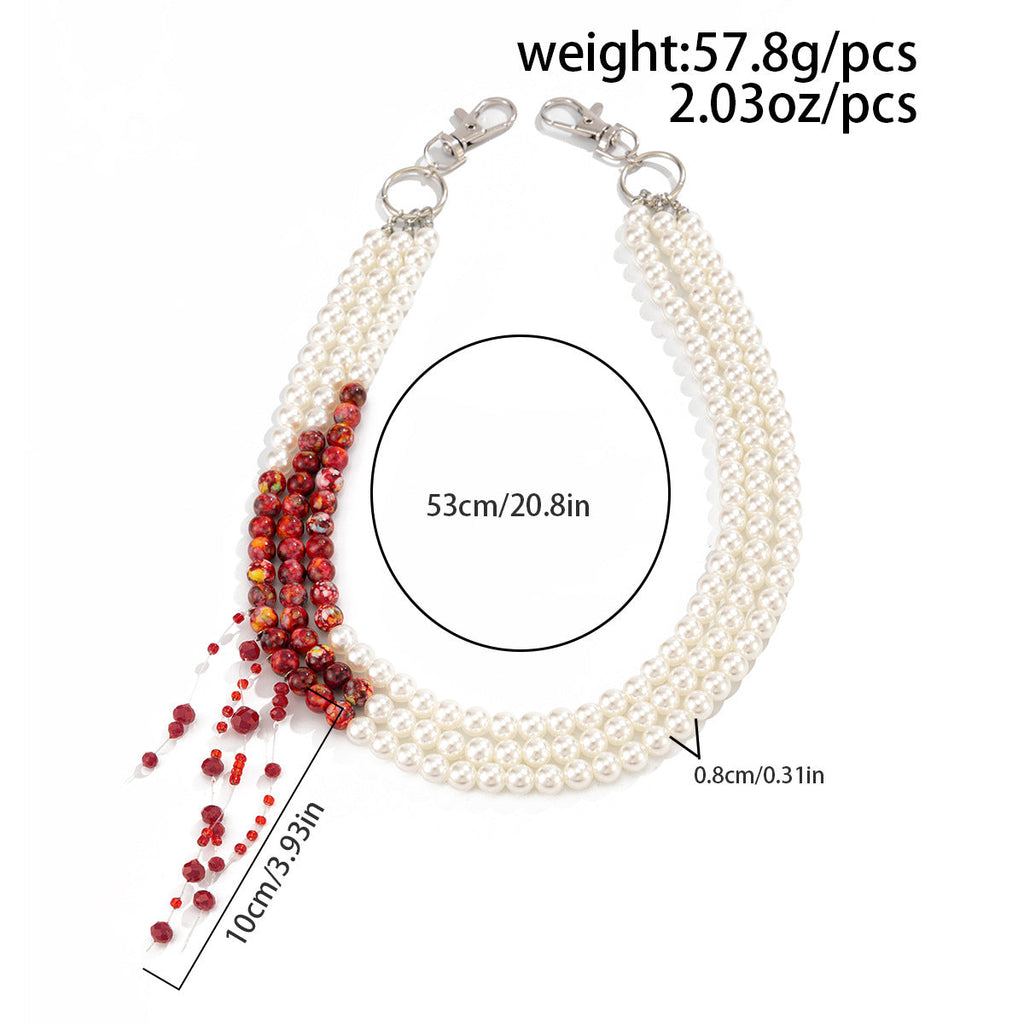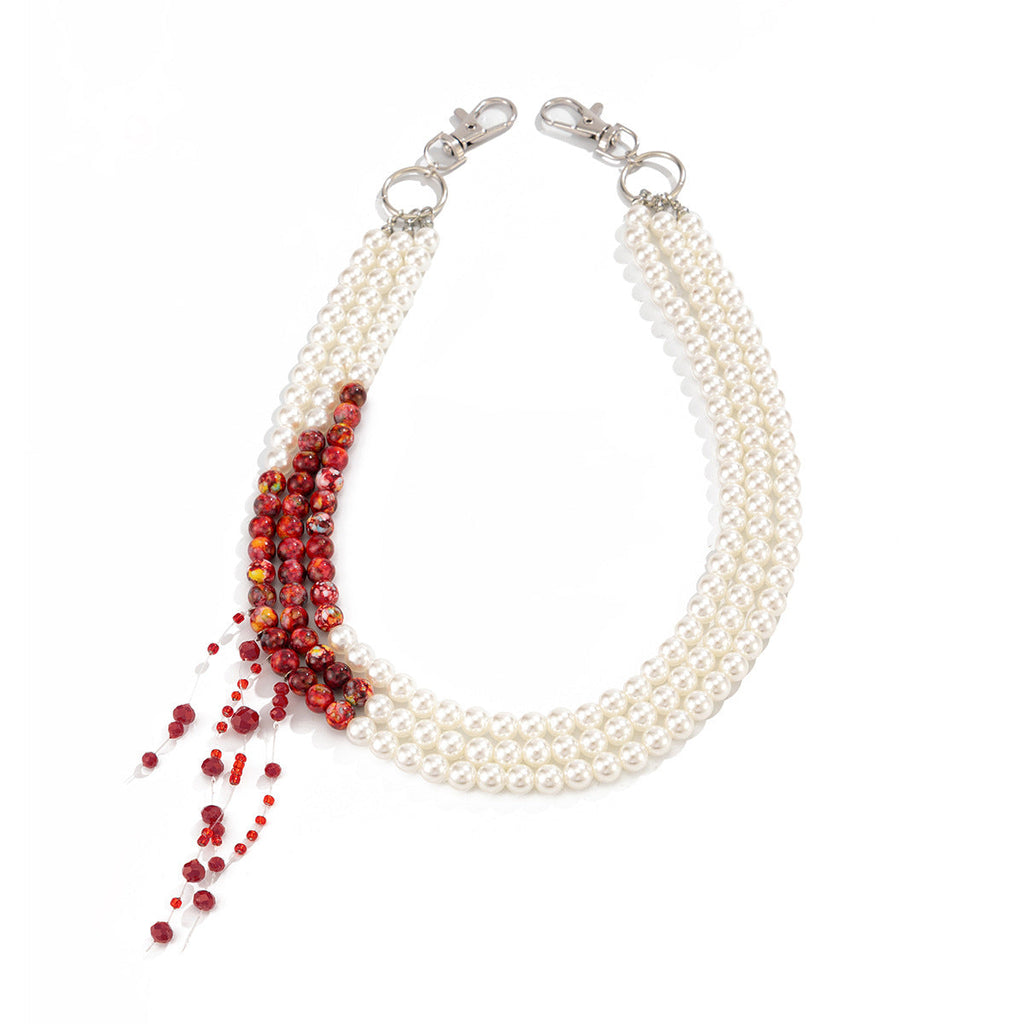 Discover the perfect fusion of classic elegance and avant-garde design with our stunning Pearl Wallet Chain, a masterfully crafted accessory that redefines layered sophistication. This exquisite Triple Wallet Chain features three beautifully graduated strandsâ€?3cm outer layer, 50cm middle layer, and 47cm inner layer—all crafted from high-quality faux pearls with a striking design innovation: a lower section of vibrant red stone beads and sparkling plastic crystals that create a captivating "dripping" effect, reminiscent of elegant falling droplets. This artistic Women Wallet Chain offers a bold yet wearable statement piece that transitions effortlessly from day to night.