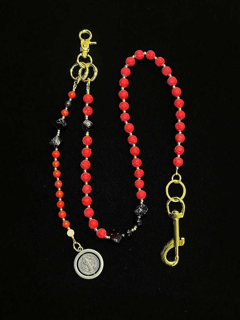 Elevate your accessory collection with our striking beaded Wallet Chain, a bold fusion of vibrant color, spiritual symbolism, and urban functionality. This 78cm chain features rich red lavastone beads, meticulously strung together and complemented by warm brass clasp details for a luxe yet edgy finish. A short extension chain near the fastener adds dynamic movement, culminating in an engraved Saint Benedict Medal—infusing the piece with meaning and distinctive style. This eye-catching beaded pants chain breaks away from conventional designs, offering a vibrant and expressive alternative for those who dare to stand out.