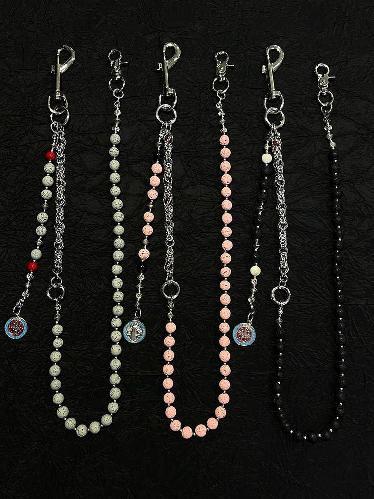 Discover the ultimate fusion of spiritual symbolism and alternative fashion with our versatile beaded Wallet Chain. This 78cm masterpiece features genuine lavastone beads in three captivating colors �classic Black, sophisticated Gray, and soft Pink �each offering a unique aesthetic for personal expression. The chain is enhanced with a meaningful Saint Benedict Medal suspended from a short auxiliary chain near the clasp, adding both spiritual significance and visual depth to this exceptional beaded pants chain.